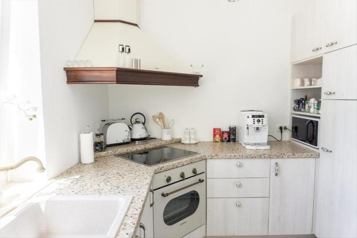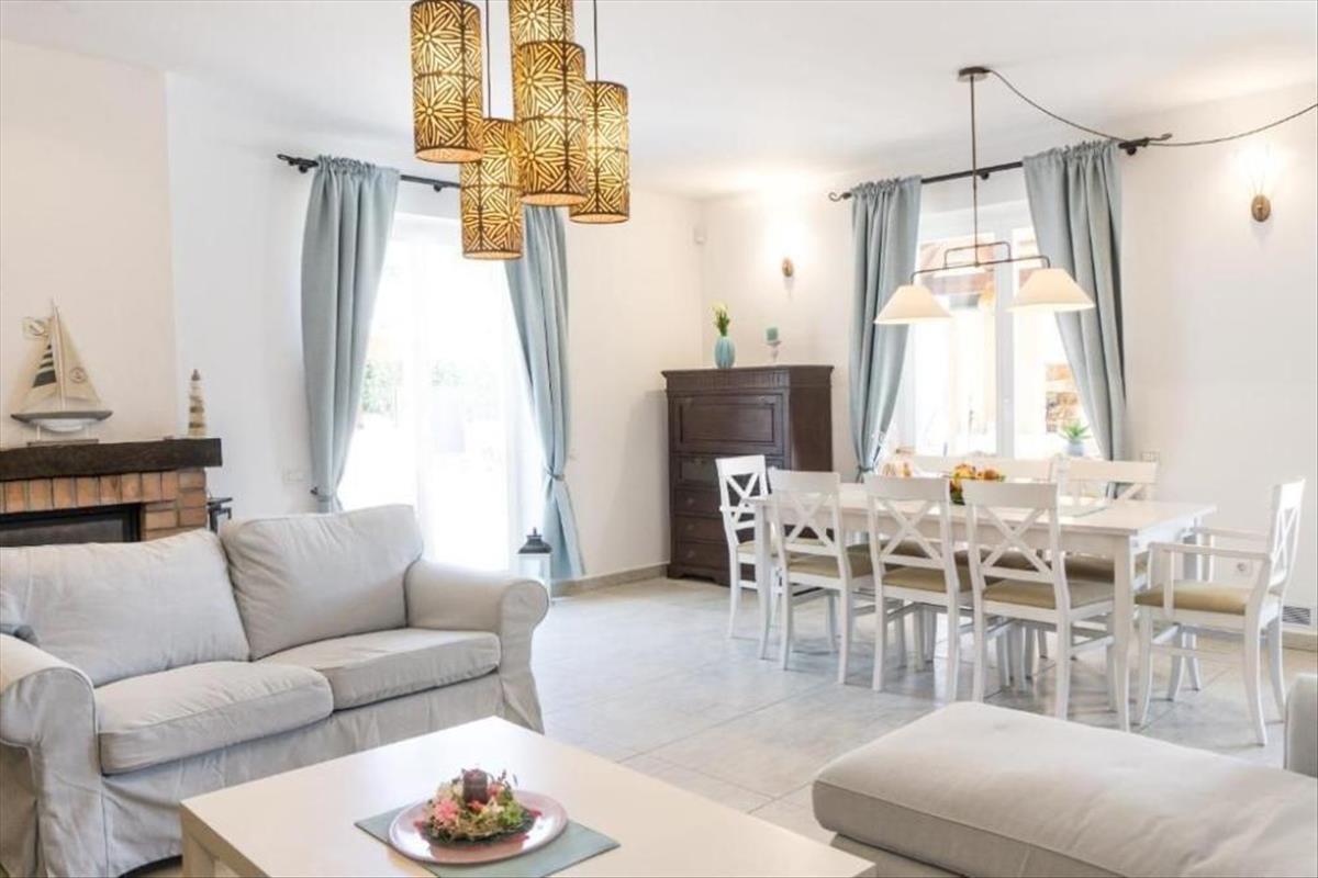 A villa földszintjén található egy nagyobb, a villa nyitott és szellős részeként kialakított nappali, ahol lehetőség van egy kényelmes nappali elszállásolására, valamint egy modern és teljesen felszerelt modern konyha étkezővel. Elegendő terület az egész család számára. a villa földszintjének ezt a részét egy nagyobb fatüzelésű kandalló díszíti, ami a helyiség fűtésére szolgál, és amely a villában való tartózkodás során is különleges hangulatot teremt. Nem szabad elfelejtenünk megemlíteni, hogy ugyanarról a területről van kilátás, valamint kijárat a kertbe és a napozóval ellátott úszómedencébe. Az említetteken túlmenően ki kell emelni, hogy a villa földszintjén a nappali mellett található az első hálószoba saját fürdőszobával, majd egy kissé különálló vendég wc és mosókonyha.