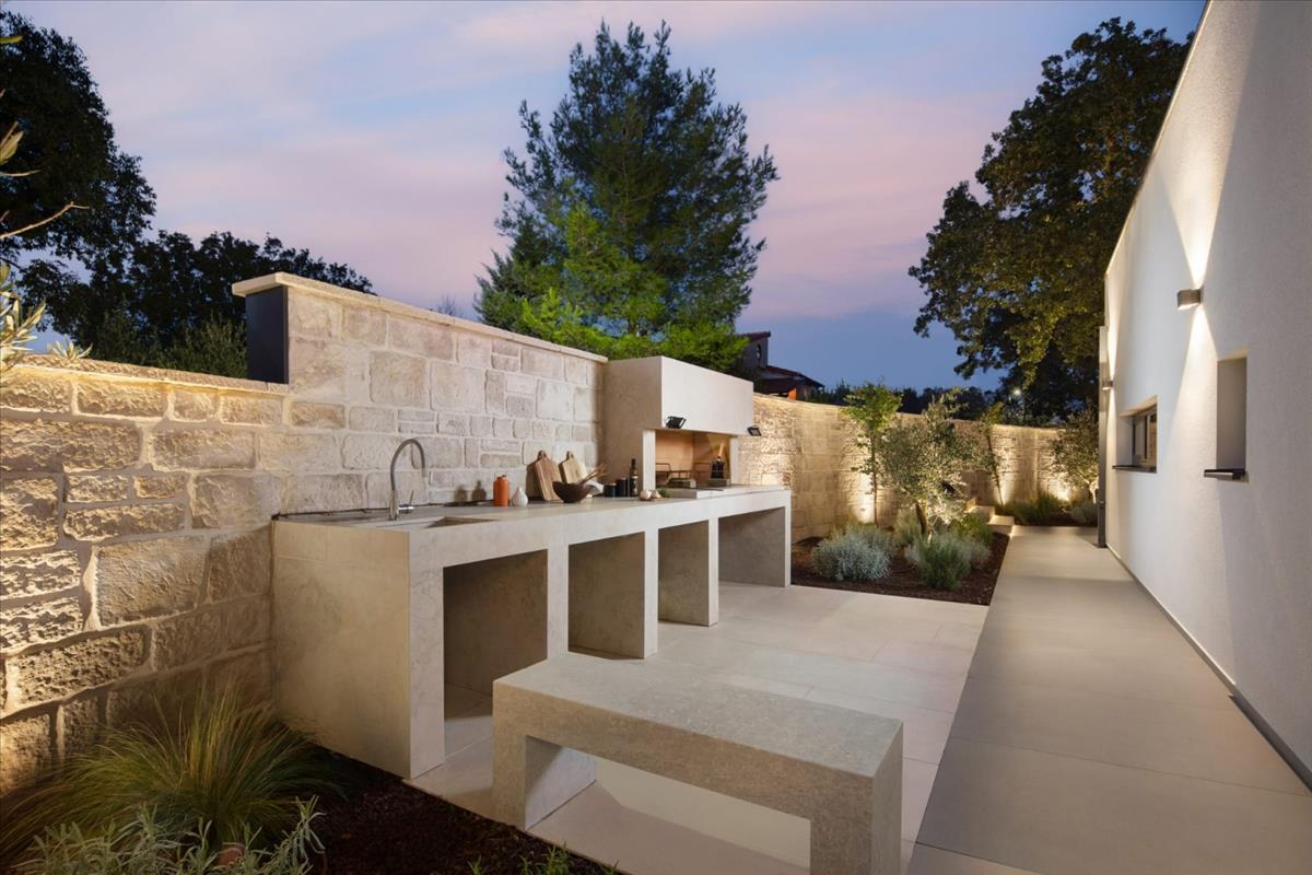 A külső tér is ugyanolyan jól felszerelt. Egy fűtött L-alakú medence napozóterasszal, jakuzzi a teraszon, fedett kültéri pihenőhely és nyári konyha grillezővel és étkezővel pergola alatt ideális helyet biztosít a pihenésre és szórakozásra. Egy kültéri kandalló meleg, hívogató hangulatot teremt a hűvösebb estéken. Az ingatlan három privát parkolóhellyel és elektromos járművek töltőállomásával is rendelkezik. Ez a villa több mint egy otthon – egy gondosan megtervezett menedék, ahol a kortárs építészet, a kényelem és a természet tökéletes egyensúlyban találkozik, mindössze néhány percre Rovinj kulturális és tengerparti szépségétől. Ref: RE-U-41384