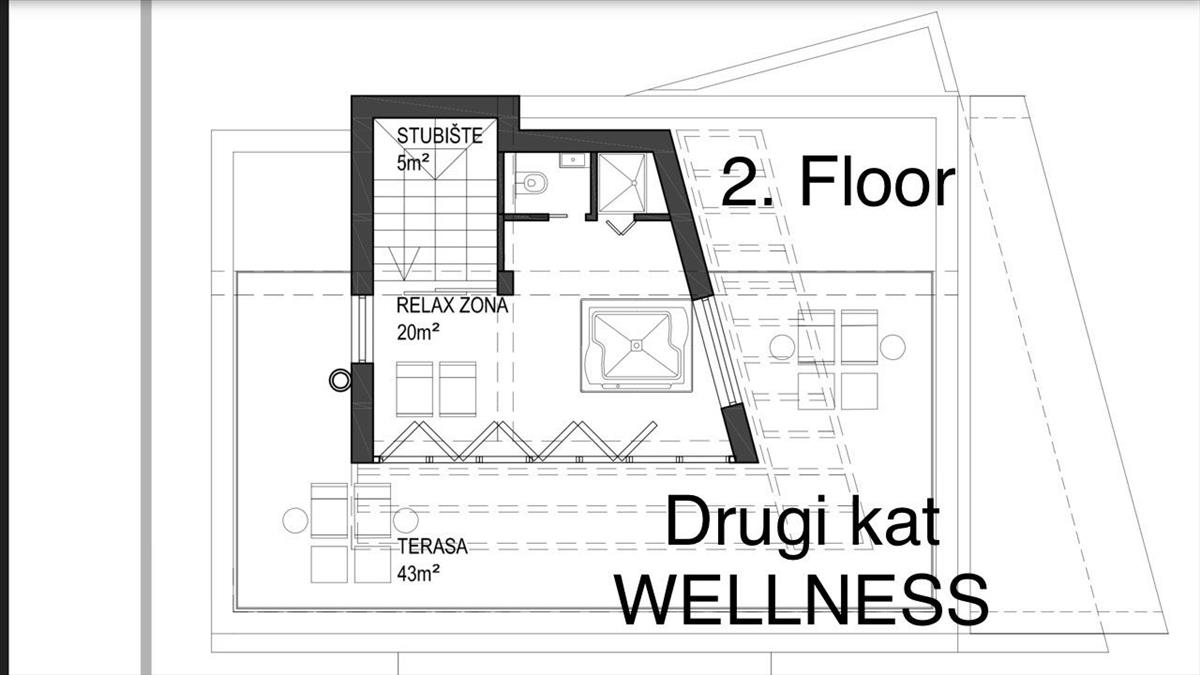 Második emelet: Pihenőterület jakuzzinak, zuhanyzónak és WC-nek, amely egy 90 m²-es panorámás tetőteraszra vezet – tökéletes egész évben tartó szórakozásra.