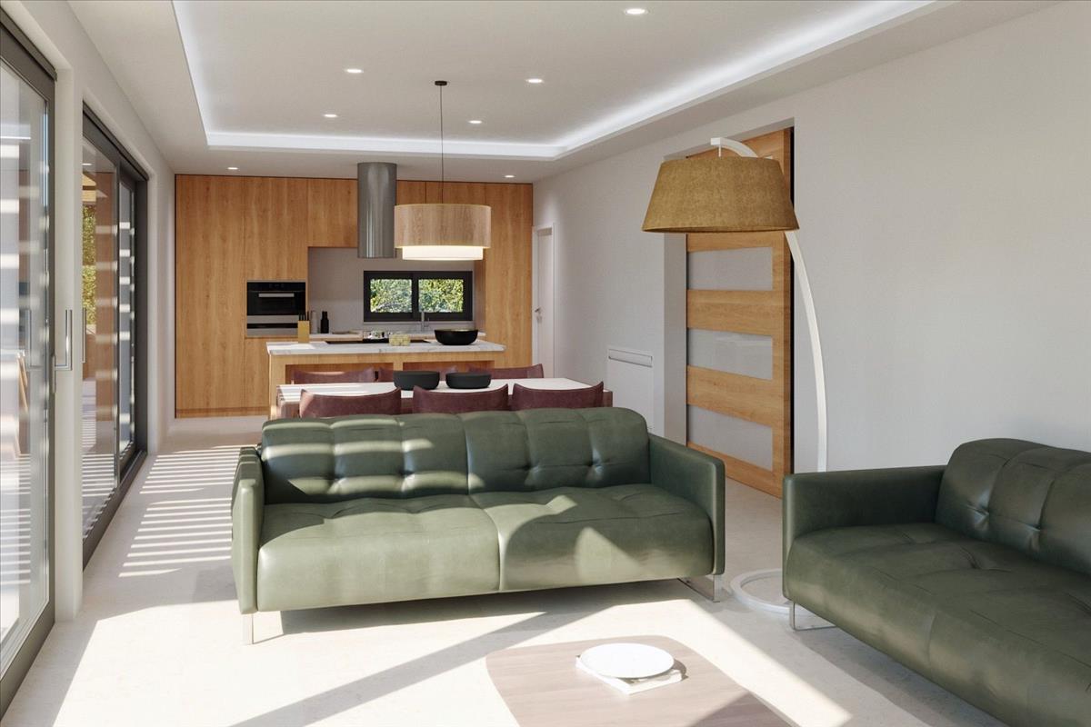 Földszint: Bejárati előtér, tágas nappali kandallóval, modern konyha, kamra, hálószoba, fürdőszoba és lépcsőház.