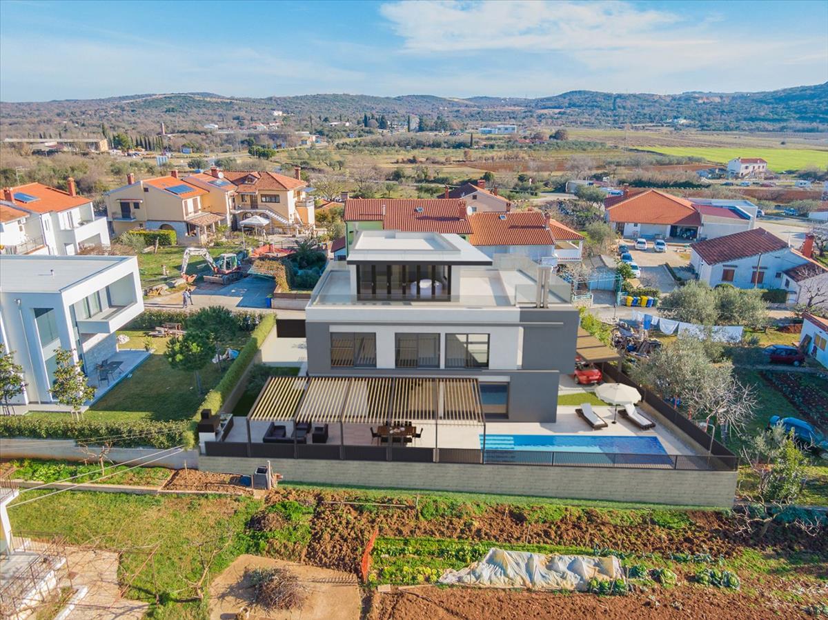 Ez a lenyűgöző, újonnan épült elkülönített villa Rovinjban luxust, modern dizájnt és kiváló elhelyezkedést kínál, mindössze 2 km-re az Adriai-tengertől. Csendes környékkel és parkosított kertekkel körülvéve az ingatlan tökéletes állandó családi lakóhelynek vagy prémium befektetésnek a turizmus számára.