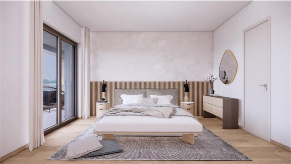 Alsó szinten bejárat, mosoda, szalon étkezővel és konyhával, hálószoba fürdőszobával, két terasz található.