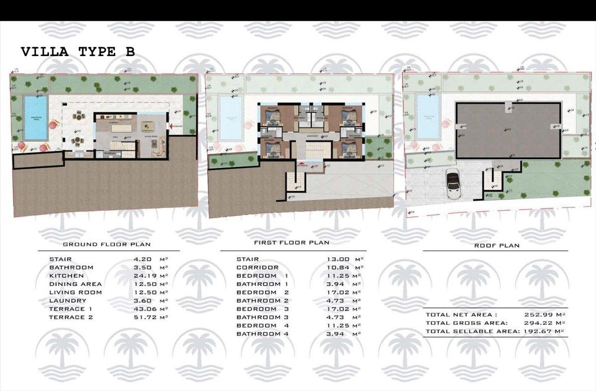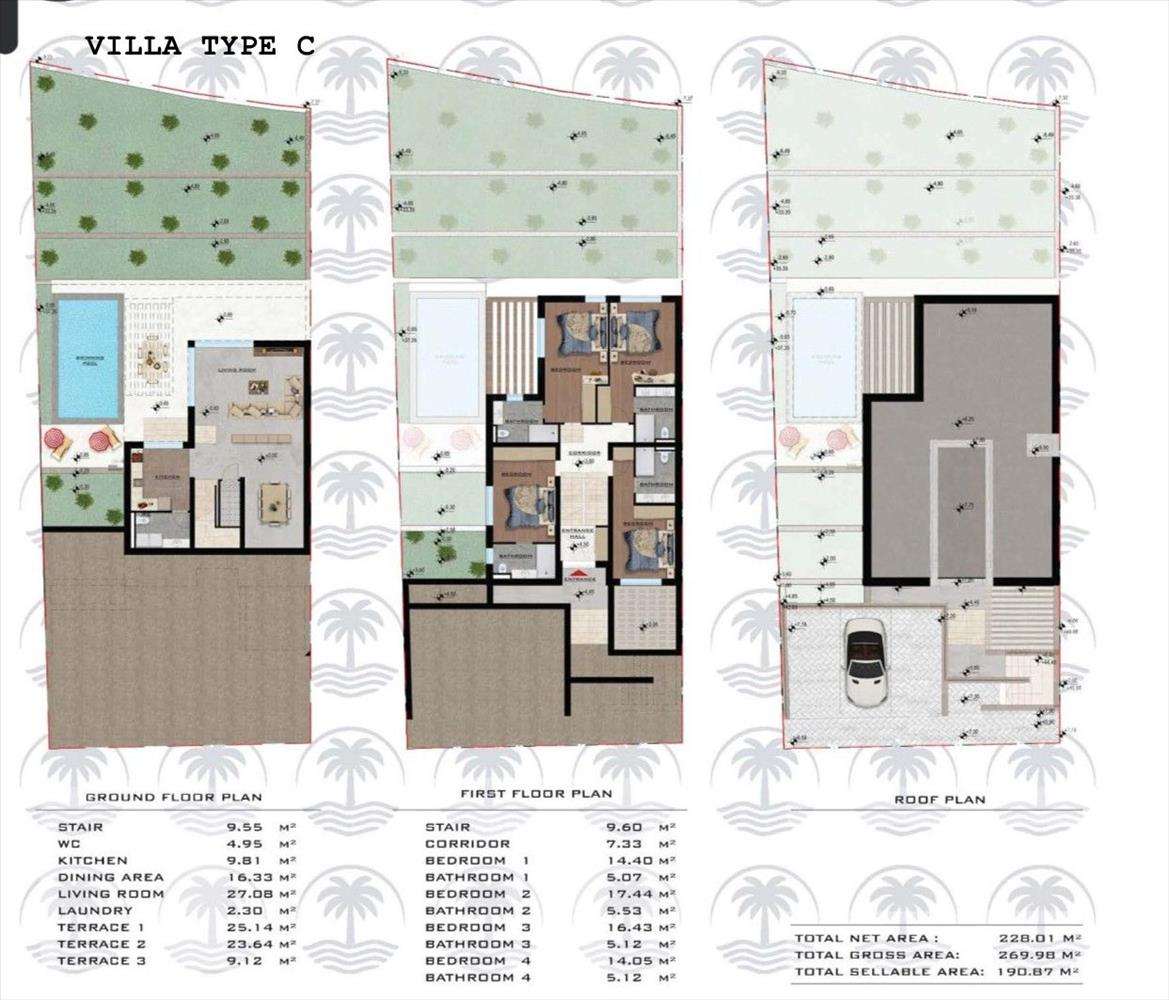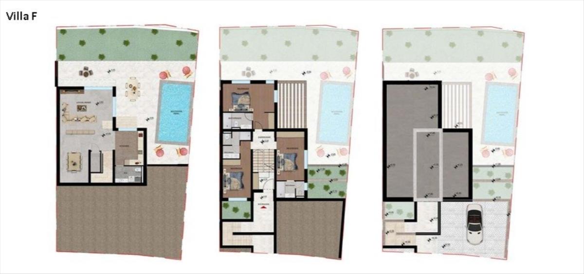Az épület külső dizájnja fokozza a mediterrán élményt, tágas teraszokkal, egy privát medencével és napozóterülettel, amelyet gondosan megtervezett zöld területek vesznek körül. a villa három privát kültéri parkolóhellyel rendelkezik, és az építkezés prémium anyagokkal és befejezésekkel történik.