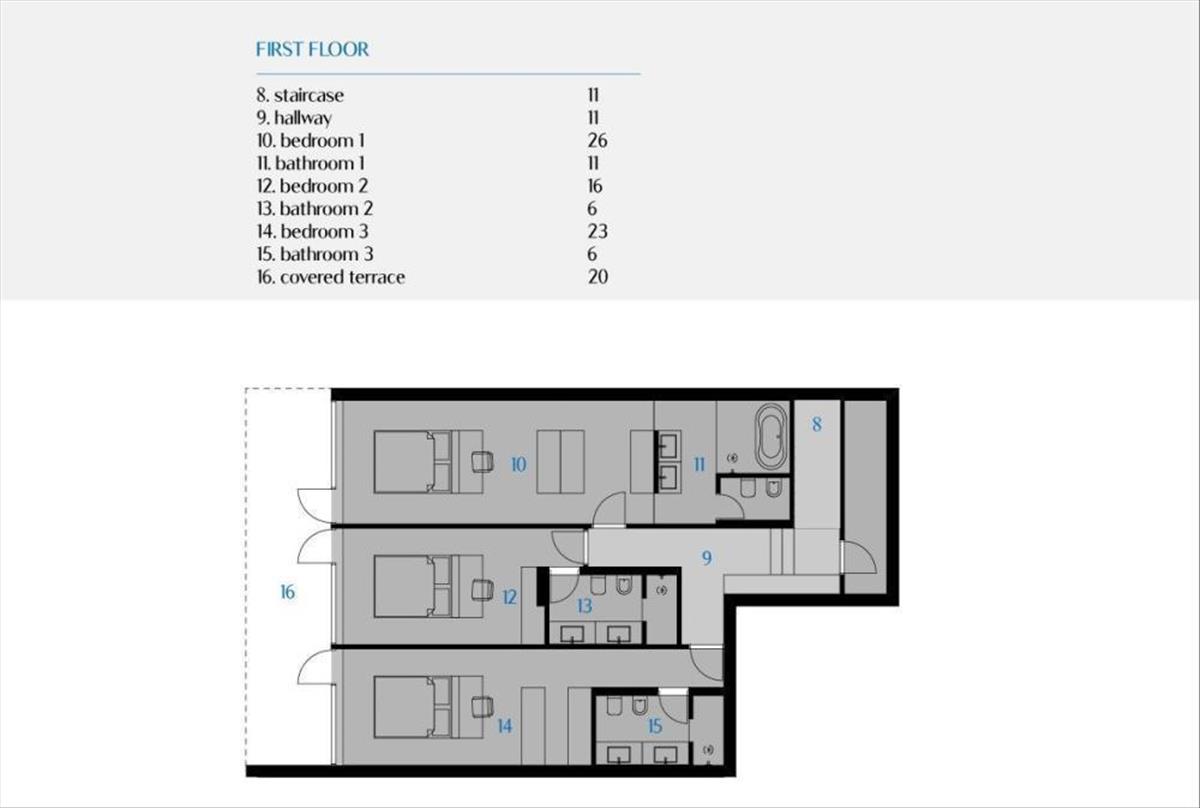 A földszinten három hálószoba található, amelyek mindegyikéhez saját fürdőszoba tartozik, ahonnan egy tágas terasz nyílik.