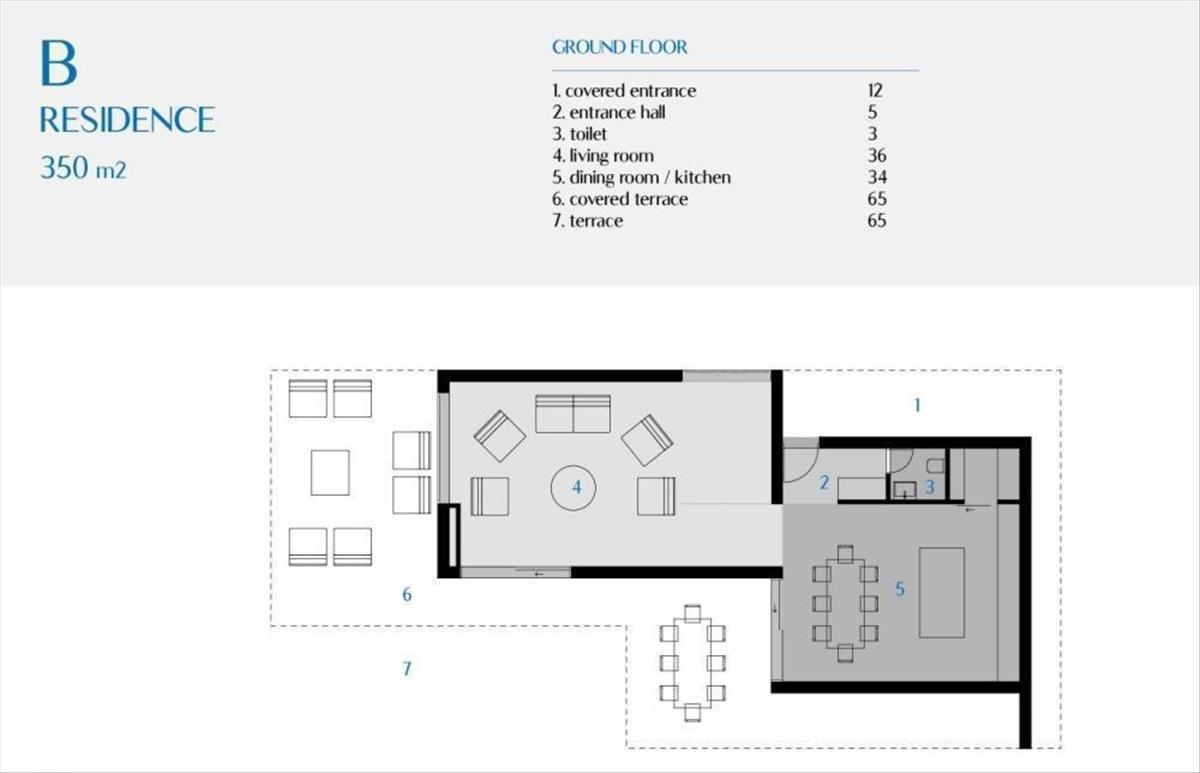 A 350 nm-es villa egy földszintből és egy felső emeletből áll, úszómedencével és kerttel.