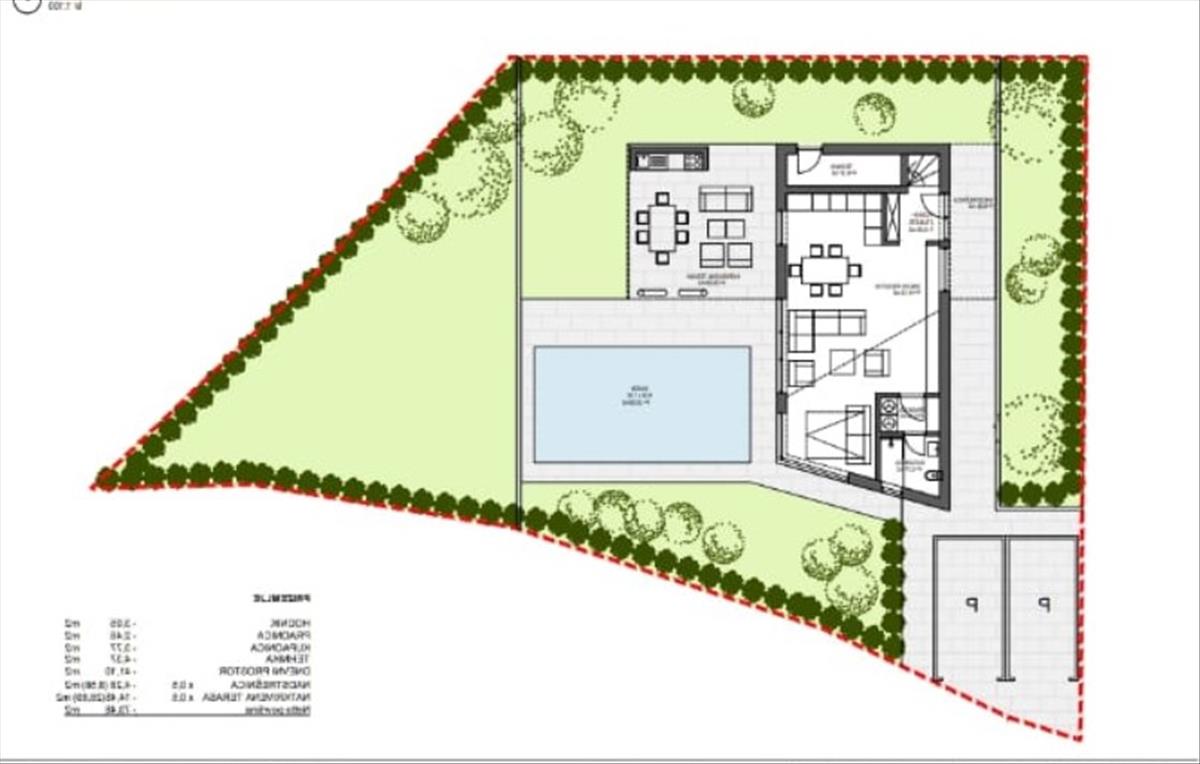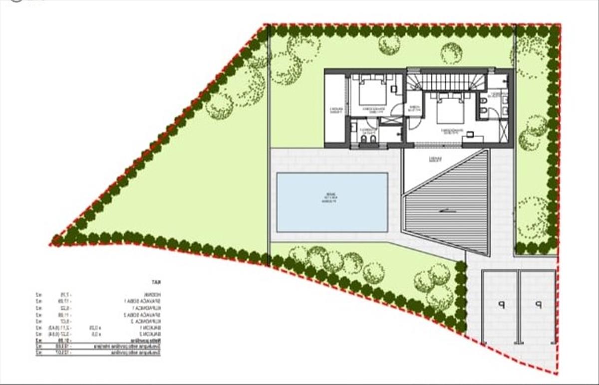 A ház teljes lakóterülete 100 m2, és egy nappaliból, konyhából, kamrából és WC-ből és két hálószobából áll, mindegyik saját fürdőszobával. a második képen látható gyönyörű tengeri kilátással élvezheti a szabadban való kikapcsolódást, a további terület két tágas erkélyből áll – mindegyik hálószobához saját.