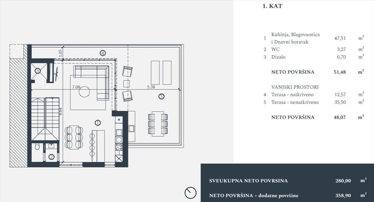 Első emelet: nyitott konyha, étkező és nappali, plusz wc, valamint egy nagy, részben fedett terasz lenyűgöző panorámás tengerre néző kilátással.