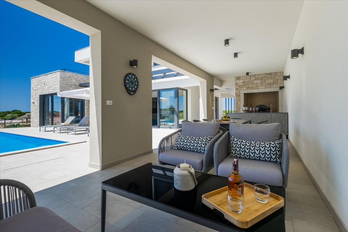 A villák kültéri területei a kikapcsolódásra és pihenésre lettek tervezve, és tartalmaznak egy nagy fűtött medencét 40 m²-es napozóterasszal, egy jakuzzit, dedikált napozó és pihenőzónákat, valamint egy fedett nyári konyhát grillezési lehetőséggel, amely tökéletes kültéri étkezéshez, szórakozáshoz és az isztriai életstílus élvezetéhez.