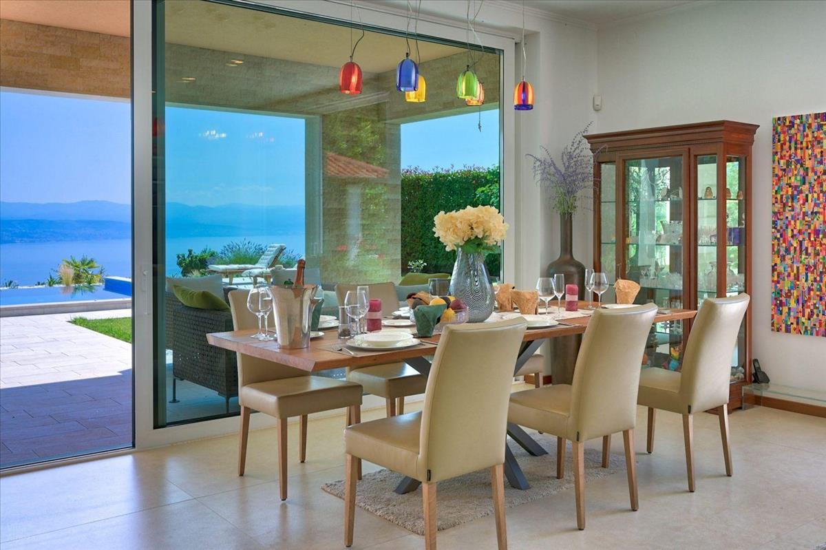 Az ingatlan leírása: Ez az előkelő családi villa összesen 343, 95 négyzetméteres lakóterülettel büszkélkedhet, amely művészien épült többszintes lakóhelyként. Belépéskor egy előszoba fogadja kedvesen az embert, amely a földszint különböző helyiségeibe vezet. Itt a család és a barátok társaságában szórakozhat és gyönyörködhet a fényűzően berendezett konyhában, amelyet egy neves olasz gyártó készített. a konyha mellett található egy tágas étkező, mely tökéletes helyszín a kedvenc finomságok megkóstolására. a hangulatos nappali, kissé elválasztva, brazil kővel díszített kandallóval rendelkezik. a fedett teraszra nyíló nagy üvegajtóknak köszönhetően az egész terület természetes fényben úszik egész nap. a teraszon túl a mediterrán növényvilággal teli kertben tágas medence található, és zavartalan kilátás nyílik a tengerre és a Kvarner-szigetekre. Ezen kívül a földszinten található egy kis tároló helyiség és egy vendég WC.