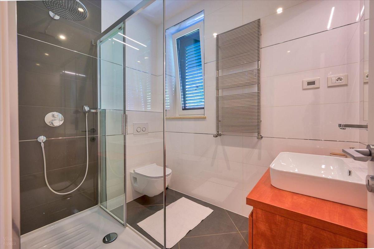 Elegáns belső lépcsőn feljutva az első emeletre jutunk, ahol három tágas hálószoba vár, mindegyikhez saját fürdőszoba tartozik. a hálószoba saját gardróbbal bővült. Minden hálószobához saját terasz is tartozik, ahonnan ugyanolyan félelmetes panoráma nyílik a végtelen tengerre és a Kvarner-szigetekre.