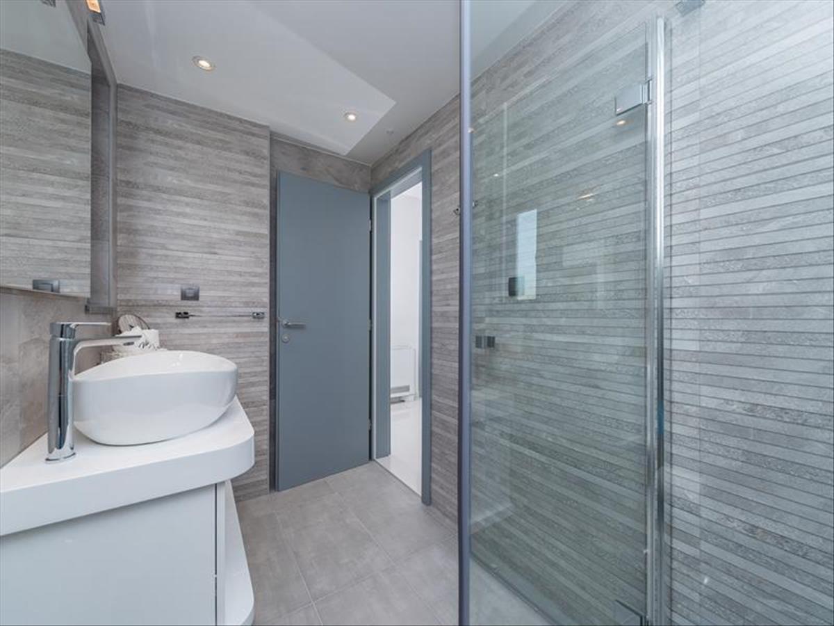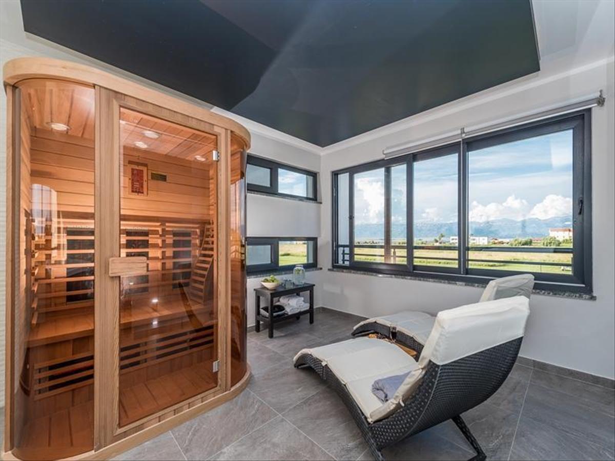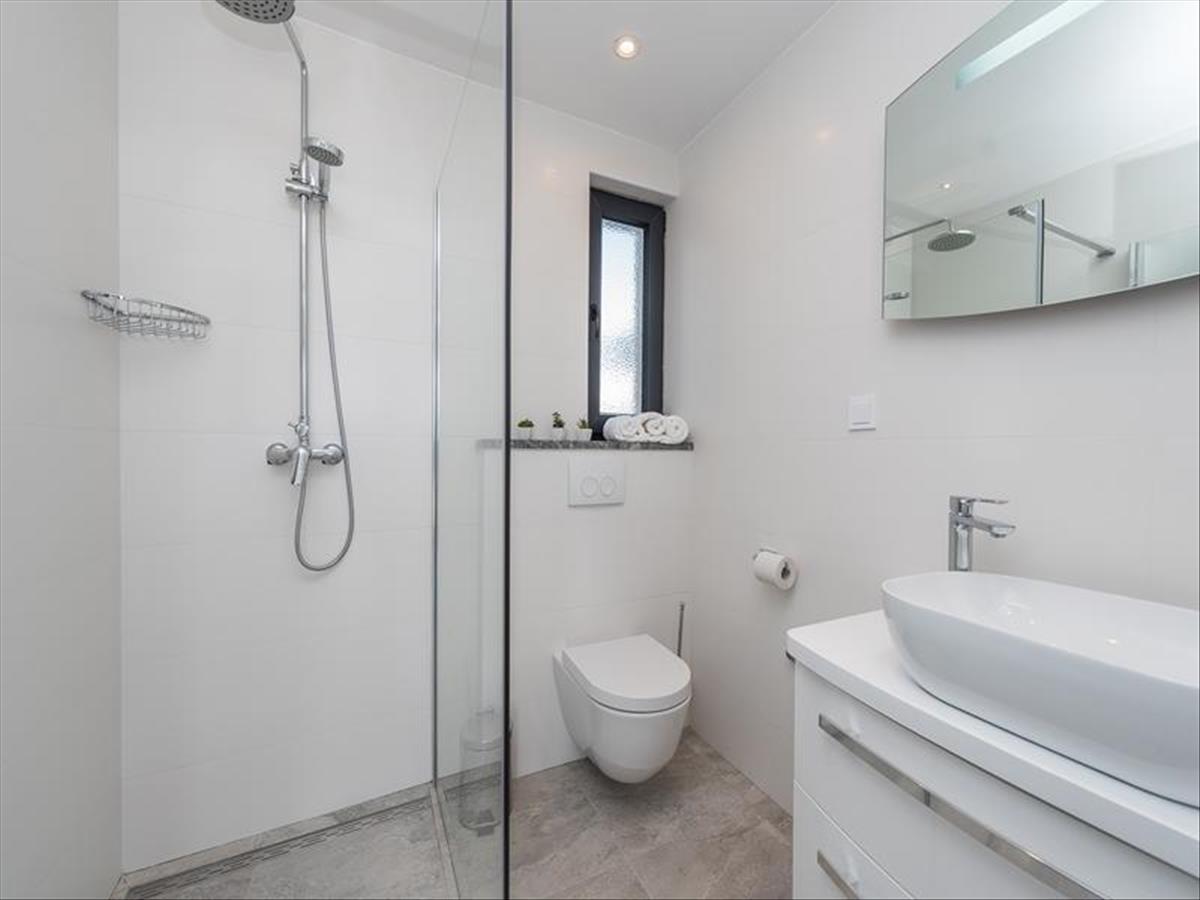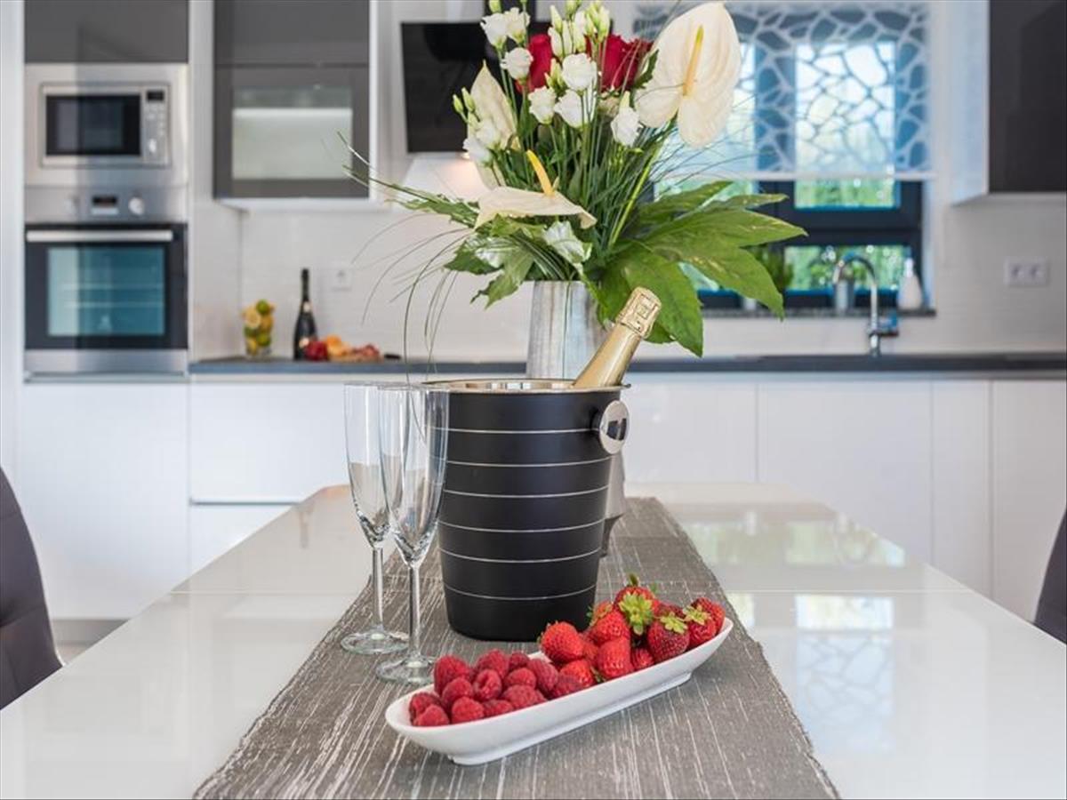 A földszinten található egy tágas konyha minden géppel és berendezéssel, étkező közvetlen teraszkapcsolattal, nappali modern kandallóval, fürdőszoba. a társalgósarok előtti teraszon 6 x 4, 5 m-es medence található anatómiai nyugágyakkal és szabadtéri zuhanyzóval. a magasföldszinten található egy 30 m2 alapterületű wellness spa oázis, melyben pezsgőfürdős masszázskád, infraszauna, zuhanyzó, nyugágyak a pihenéshez, kilátással a tengerre és a Velebit hegyre. További hangulatot ad a csillagos égbolthoz hasonló mennyezet és a pezsgőfürdő feletti tetőkupola.