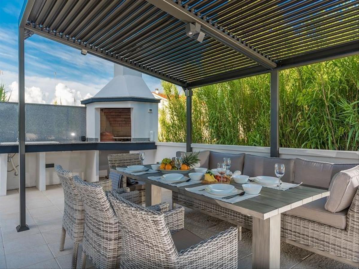A Villa oldalán található egy grillterasz, eredeti rattanból készült asztallal, ülőgarnitúrával és kanapéval, valamint szabadtéri grillsütővel. a terasz el van rejtve a kilátás elől, és kilátást nyújt a tengerre és a zöldre. a Villa hátsó részében, közvetlenül a grillterasz mellett található egy sarok, ahol minigolffal lehet szórakozni. Az udvar teljesen bekerített, mediterrán növényzettel és gyógynövényekkel dúsított. a Villa megközelítését egy jól karbantartott, privát, bekötőút biztosítja, közvetlen hozzáféréssel a parkolóhoz és a garázshoz.