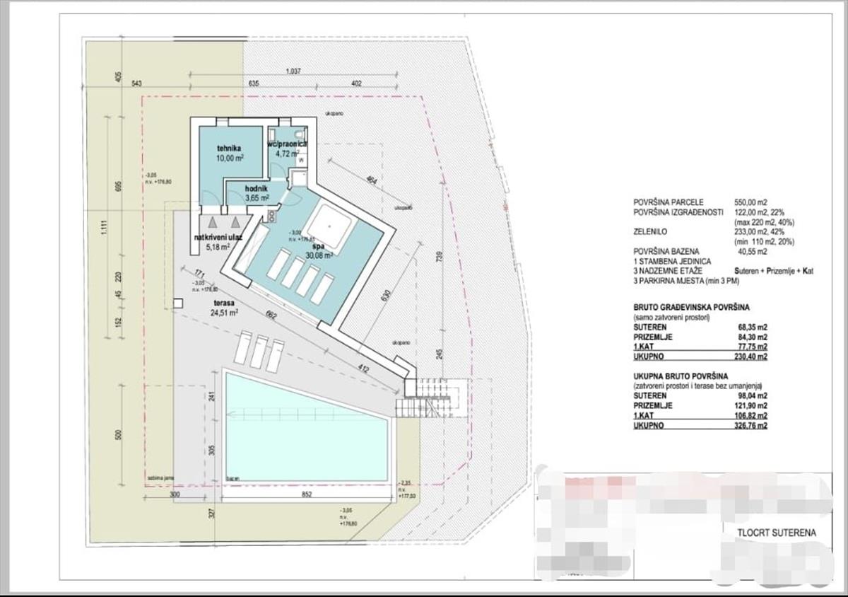 Három szinten terül el. a pincében található egy műszaki helyiség, folyosó, wc és mosókonyha, wellness részleg jacuzzival, 3 x 2, 5 m. Kint egy tágas terasz található napozó résszel és egy 11 x 4, 5 méteres medencével.