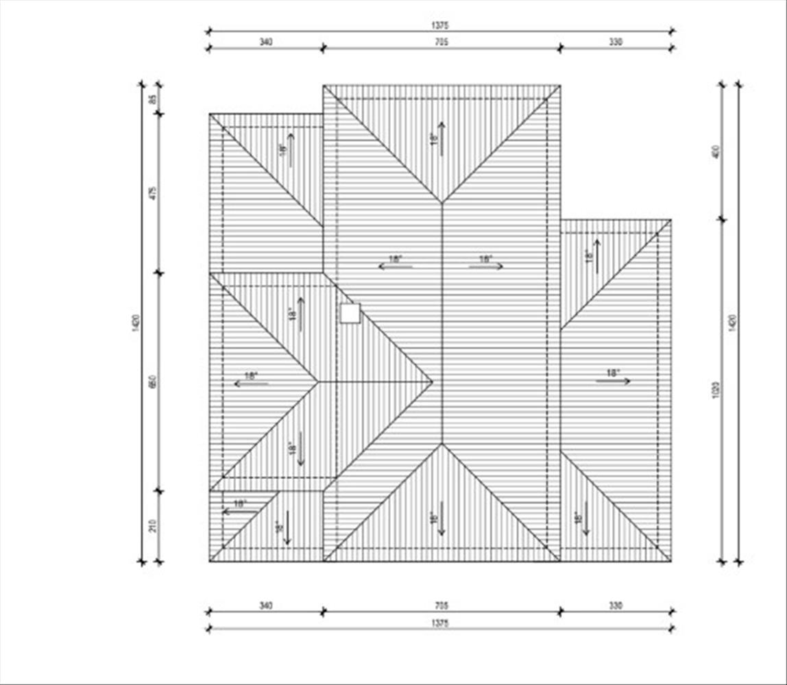 Épített ház kész tetővel és ereszcsatornával.