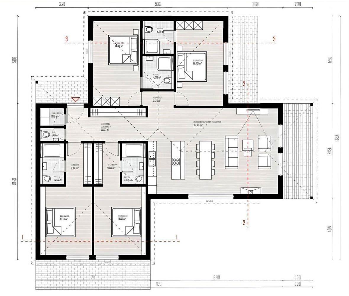 Az időtlen építészettel rendelkező ház a modern dizájnt rusztikus bájjal ötvözi, kő díszítéssel és hagyományos stílusú ereszekkel. Egyszintes lakóépületnek tervezték, és nyitott elrendezéssel büszkélkedhet, amely zökkenőmentesen köti össze a konyhát, az étkezőt és a nappalit, amelyek mindegyike egy fedett teraszra nyílik. a házban négy hálószoba található, mindegyik saját fürdőszobával, egy vendég WC-vel és egy háztartási helyiséggel.