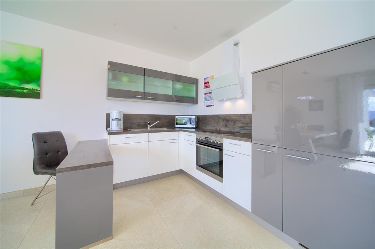 Lépjen fel az első emeletre, ahol két tengerre néző apartman található, amelyek a földszinti elrendezést tükrözik—83, 39 négyzetméter és 81, 46 négyzetméter—mindkettő azonos szobakialakítással és privát erkélyekkel, amelyek lélegzetelállító kilátást nyújtanak a türkizkék Földközi-tengerre, a szomszédos Plavnik és Cres szigetekre, valamint a felejthetetlen naplementék látványára, amelyet a medence melletti világítás varázsol el.