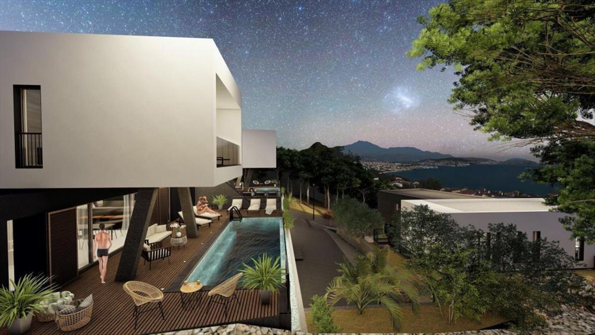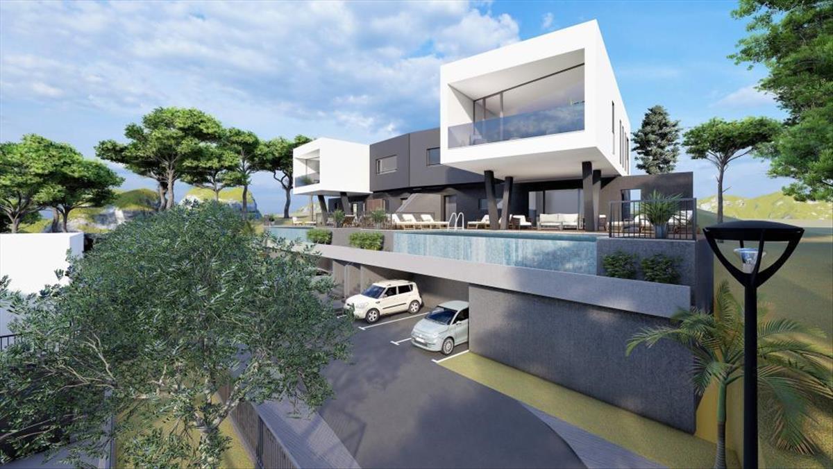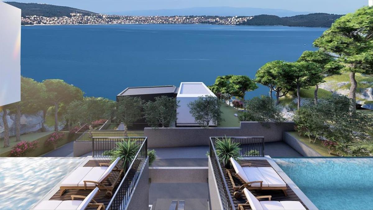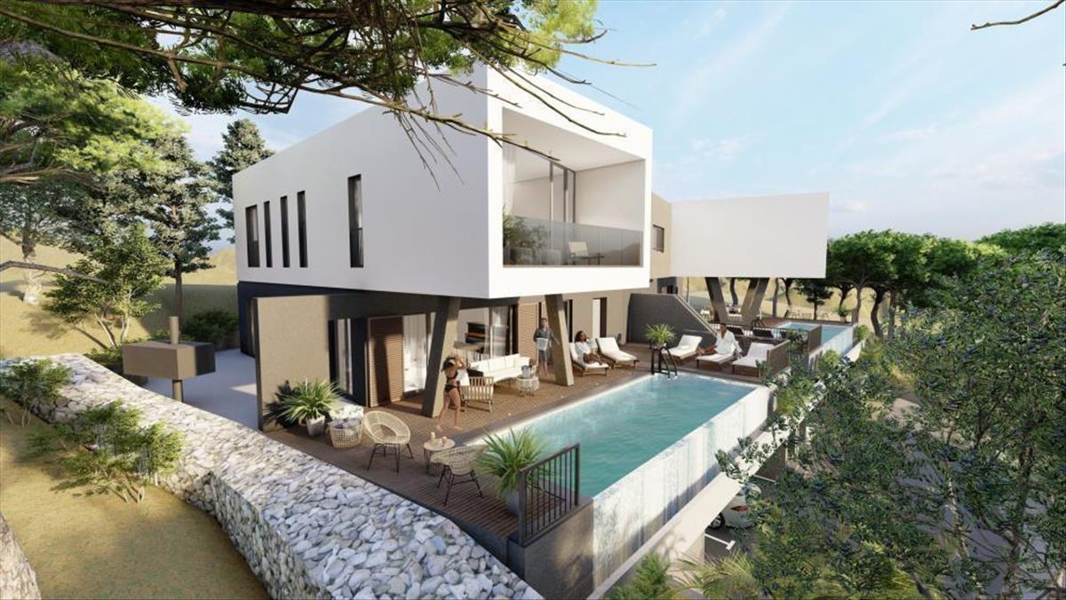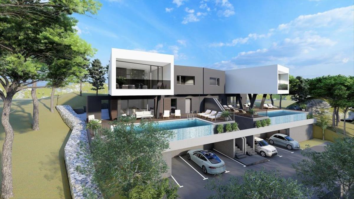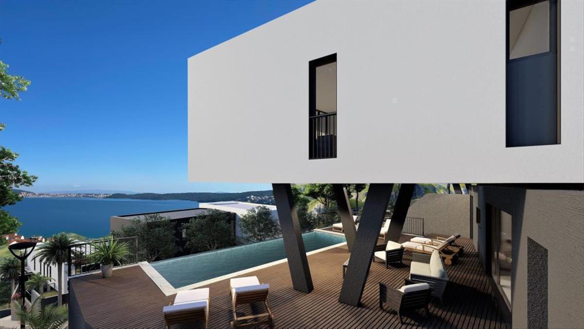 Vonzó futurisztikus dizájn ingatlan egy tekintélyes helyen, mindössze 300 méterre a strandtól Seget Donji üdülőhelyen, 5 km-re az unesco által védett történelmi Trogir városától.Egy 5 vonzó modern villából álló komplexum része, amelyek tökéletesen integrálódnak egy csodálatos mediterrán környezetbe. Mindössze 10 km-re található a spliti nemzetközi repülőtértől.