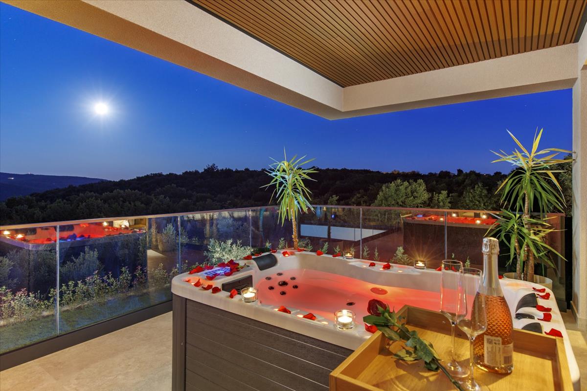A tágas kert elegánsan parkosított, füves területekkel, mediterrán növényekkel és fiatal olajfákkal. Egy fűtött, 24 négyzetméteres medence napozóterasszal egészíti ki a kültéri teret, harmonikus környezetet teremtve a pihenéshez és a szórakozáshoz.