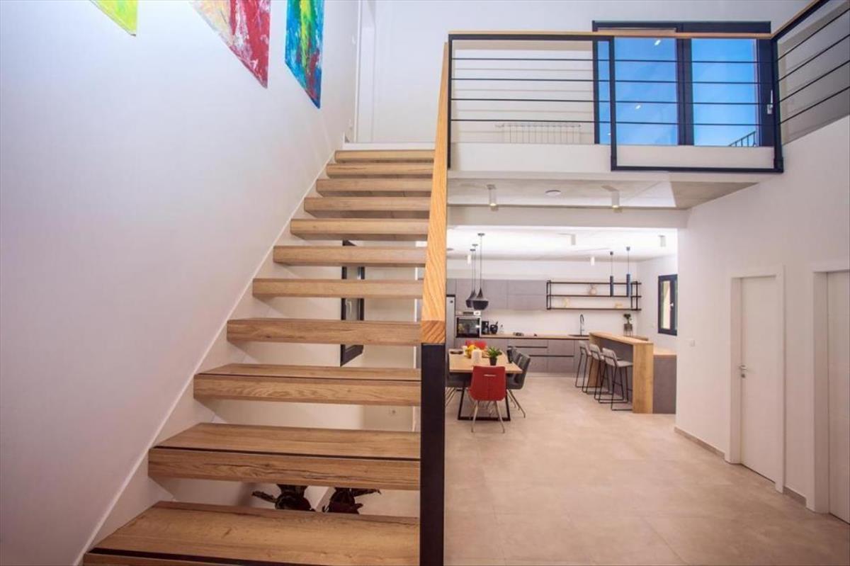 A beton mennyezet a falfestményekkel és az elegáns lépcsőházszerkezettel kombinálva ultramodern és kifinomult hangzásúvá varázsolja a villát.
