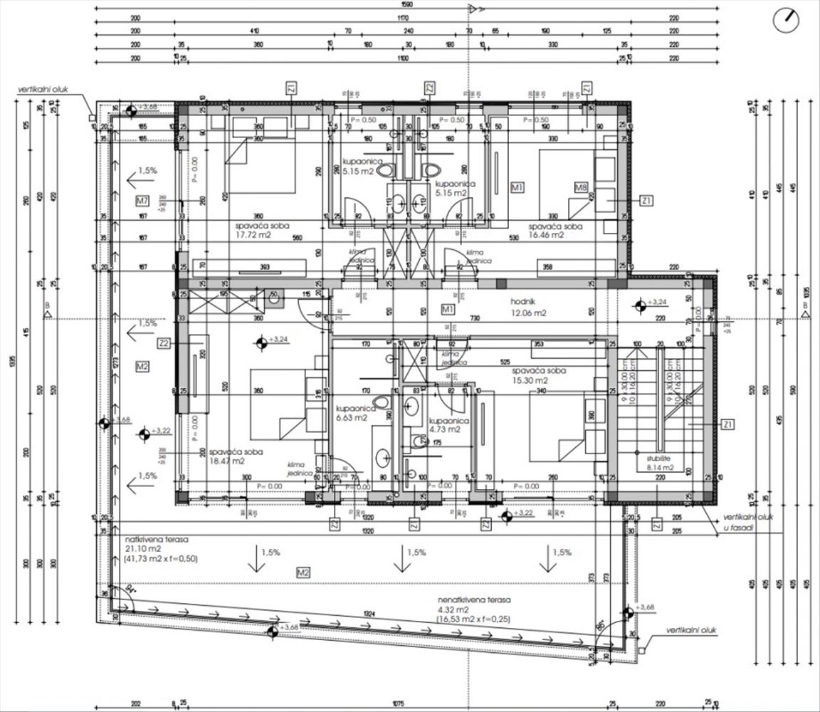 A gyönyörű villa első emeletén egy folyosó, négy hálószoba található saját fürdőszobával és egy fedett terasz.