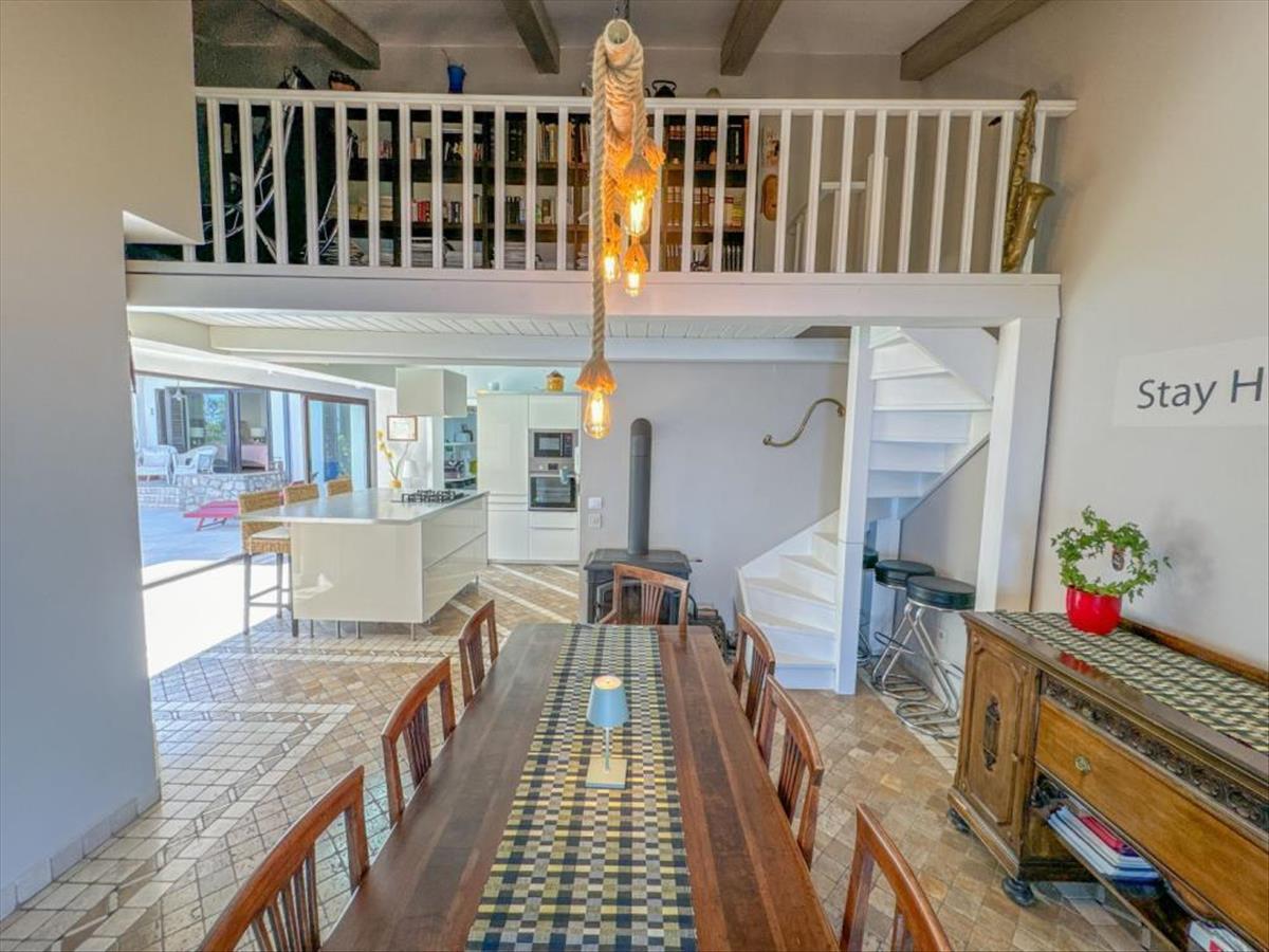 Kiemeljük a gyönyörű, nyitott terű nappalit, amely ideális különféle tevékenységekhez a társasági életen kívül, tágas étkezővel és konyhával összekapcsolva. Az egész tér lenyűgöző és zavartalan kilátást nyújt a Kvarner-öbölre, az étkezősarokkal pedig egy bájos erkélyre vezet, amely eláll a lélegzetétől. a szépen berendezett, teljesen felszerelt konyhából ki lehet jutni a medencés teraszra.