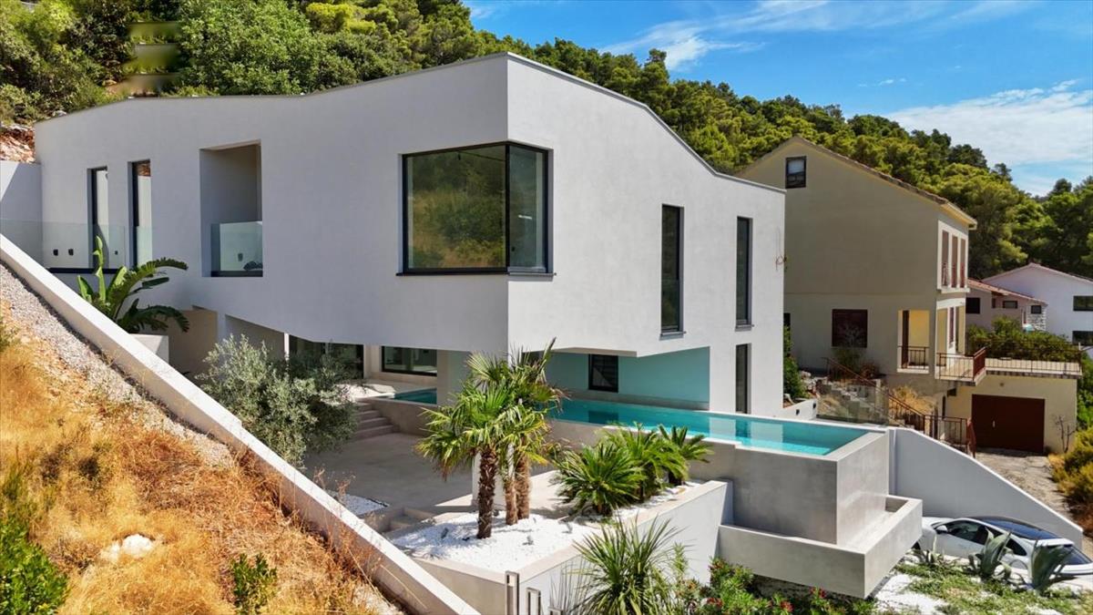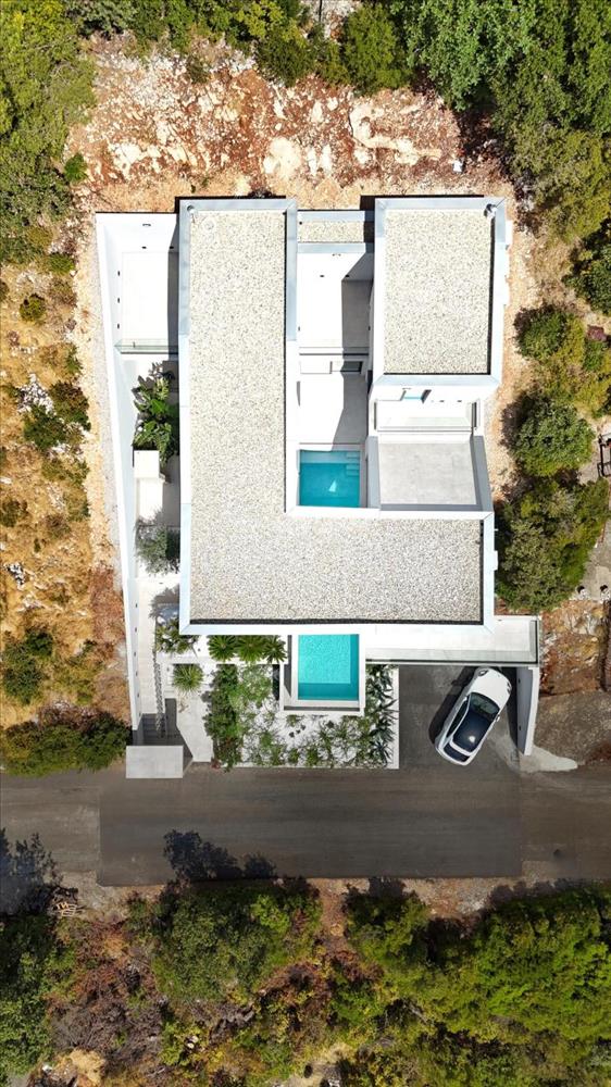 A villa bejárata az utcai szintről nyílik, és egy több szintes teraszra vezet, amely magában foglalja a medencét, a napozóteraszt és egy nyári konyhát, mindezek zökkenőmentesen illeszkednek a mediterrán tájba.