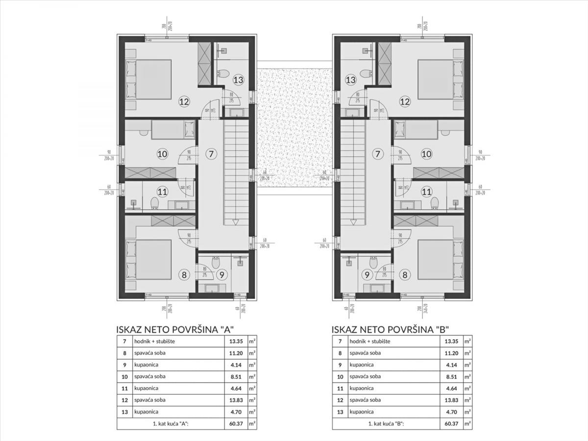 A lakóegységek alapterülete 118, 87 m² és 119, 53 m². Minden lakóegység földszintjén egy nyitott elrendezésű tér található, amely egyesíti a konyhát, az ebédlőt és a nappalit, ahonnan fedett terasz, fürdőszoba és tárolóhelyiség nyílik, míg minden lakóegység első emeletén három hálószoba található saját fürdőszobával. a feltüntetett ár a lakóépület befejezetlen kivitelére vonatkozik a durva építési fázisig, amely lehetővé teszi a végső dekorációt az Ön kívánságai és preferenciái szerint. Az építés utolsó szakaszában lévő ingatlan bútorozás nélkül, parkosított kerttel ármódosítással megvásárolható. Az ingatlan kiváló elhelyezkedése, belső és külső térrendezése lehetőséget ad egy kényelmes családi életre, vagy egy turisztikai bérbeadási vállalkozásba való befektetésre. Ref: RE-U-37395