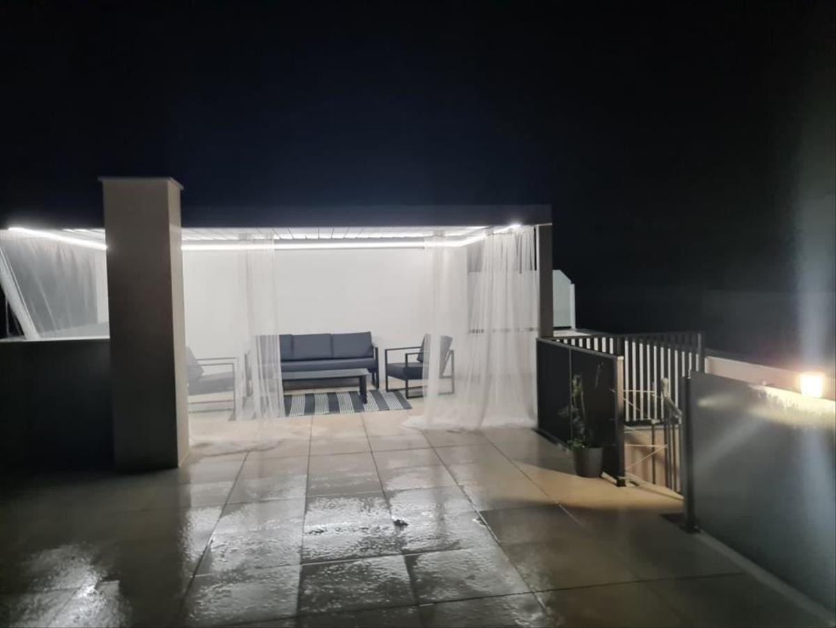 A 400 m2-es hátsó udvar bőséges parkolóhelyet biztosít 2-3 autó számára, rengeteg természetes növényzetet olajfákkal, valamint egy 40 m2-es medencét napozórésszel, amely ideális a forró nyári napokra.