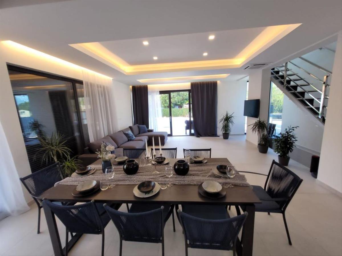 A ház összesen 156 m2 lakóterülettel rendelkezik, két szintre osztva. a földszinten egy teljesen nyitott tér található egy kis előszobával, amely egy napos és szellős területre vezet. Ezen a területen található egy modern, luxus szigetes konyha, az egész család számára ideális étkező, valamint egy jól beépített tágas nappali. Az egész tér kilátást nyújt, és hozzáférést biztosít a hátsó udvarhoz, ahol egy medence található. Ezen kívül a földszinten található egy tároló helyiség, egy vendég wc mosókonyhával.