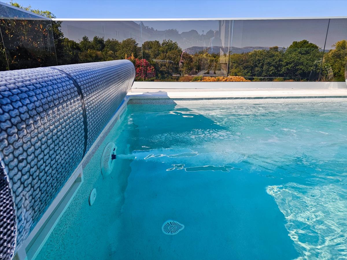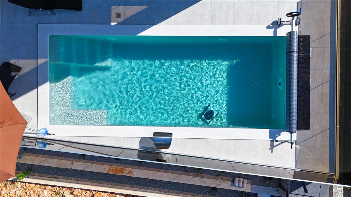 A nappaliból és a konyhából egy nagy teraszra léphet ki, amely a tulajdon legfőbb ékessége: a medence. De nem akármilyen medence – ez egy fűtött sós vízű medence masszázs fúvókákkal és ellenáramú úszórendszerrel. Egy földalatti gépészeti helyiség hőszivattyúval biztosítja a zökkenőmentes működést. a medence világos színű vízálló kulir bevonattal van ellátva – nem kerámiával vagy fóliával – amely egyedi tónust és kivételes tartósságot kölcsönöz neki. a kert mediterrán növényekkel van tájépítészetileg kialakítva, és tartalmaz egy napozóterületet, kültéri zuhanyt és grillező sarkot.
