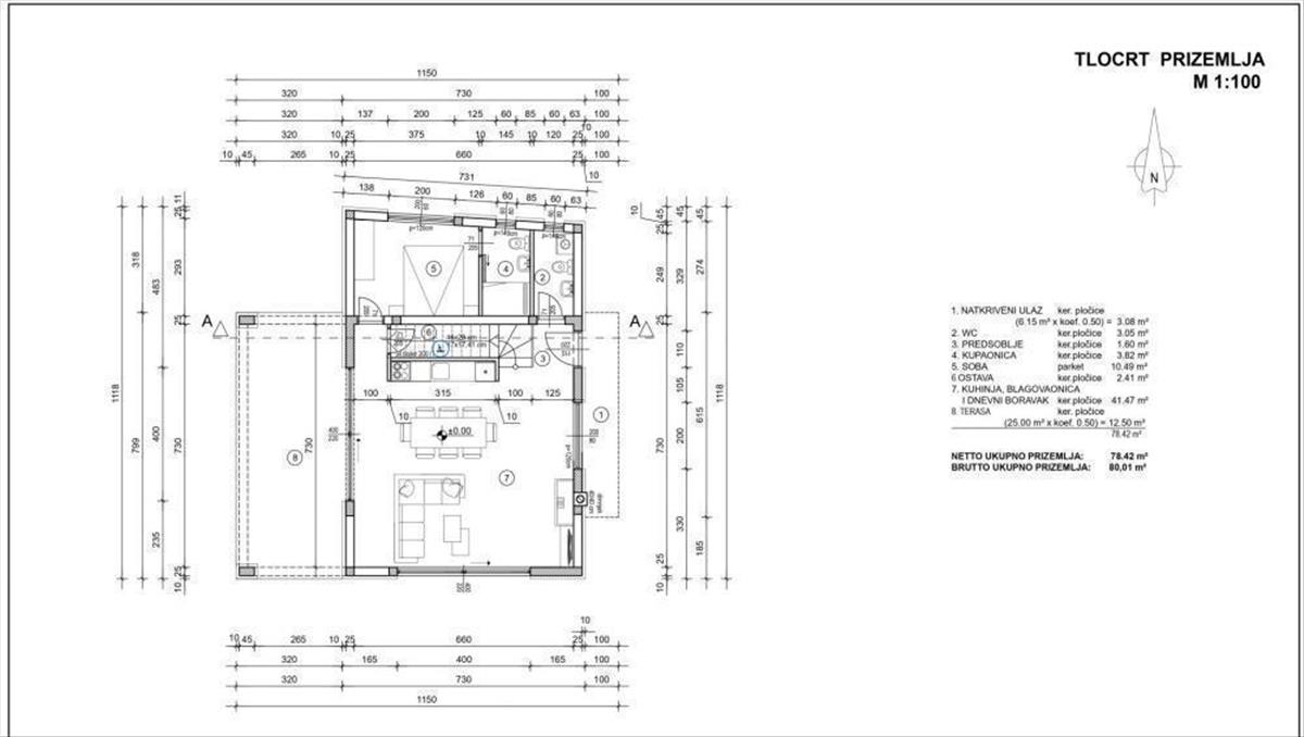Az első hálószoba (10, 49 m2) fürdőszobával (3, 82 m2) a földszint privát részén található. Továbbá található egy tároló (2, 41 m2) és egy vendég wc (3, 05 m2). a mindennapi életet és szórakozást szolgáló, nyitott térként kialakított területen (41, 47 m2) található egy tágas nappali étkezővel és konyhával, ahonnan ki lehet jutni a kültéri fedett teraszra (25 m2 0, 25 együttható szerint). = 12, 5 m2 ), ahonnan a kilátás az uszoda és a parkosított terület többi része felé nyúlik.