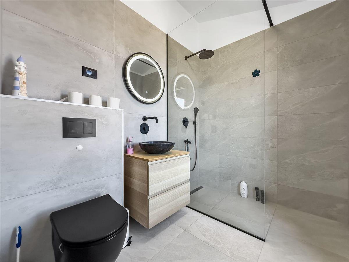 15–20 cm vastag istriai kővel burkolt homlokzatMagas minőségű Gealan ablakok és ajtókElektromos redőnyökLégkondicionálás minden szobábanPadlófűtés hőszivattyúvalRiasztórendszer és videó megfigyelés a fokozott biztonság érdekébenParkolás és magánélet