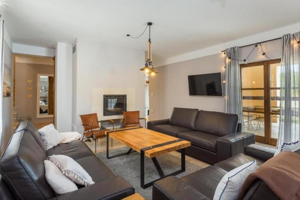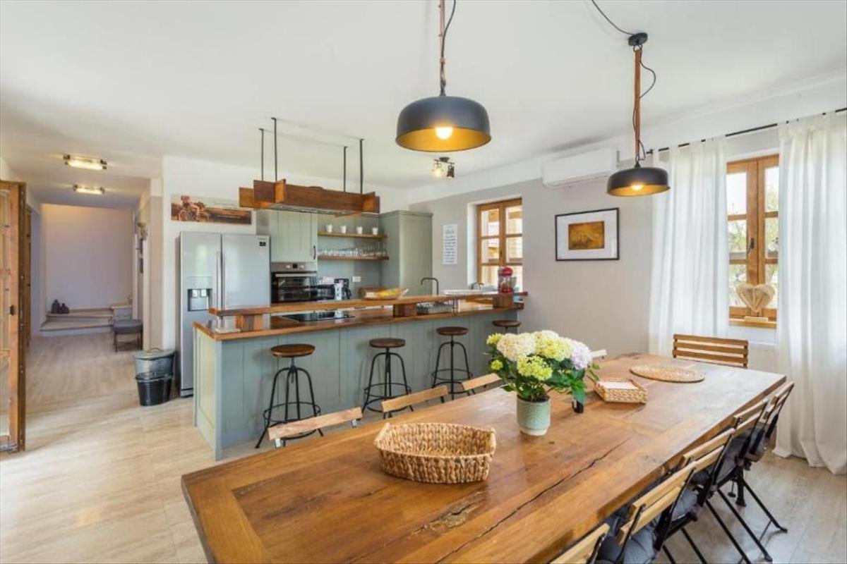 Így a villa földszintjén található egy előtér, amely elválasztja a privát/hálóteret a lakótértől. Nagyobb nyitott térben egy rusztikus és jól felszerelt étkezős konyha, valamint egy kandallós nappali kapott helyet, melyet szintén nagy üvegfal díszít, kilátással a medencére és a kertre. Ugyanezen az üvegfalon keresztül közvetlen átjárás van a külső nagyobb fedett teraszra nyári konyhával és kandallóval. a villa földszintjén két fürdőszobás hálószoba is található.