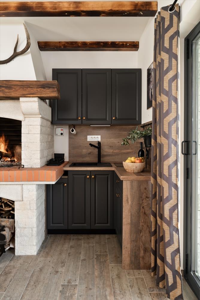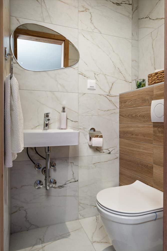 A földszinten wellness részleg található szaunával, jakuzzival, két fürdőszobával és egy walk-in zuhanyzóval. Van egy társalgó is, amely egy kandallós borozóból, konyhából és borospincéből áll. a wellness és társalgó terek egy gyönyörű fedett teraszra és a fűtött medencére nyílnak, mindez a környező természetre néz. További tárolóhely is található ezen a szinten.