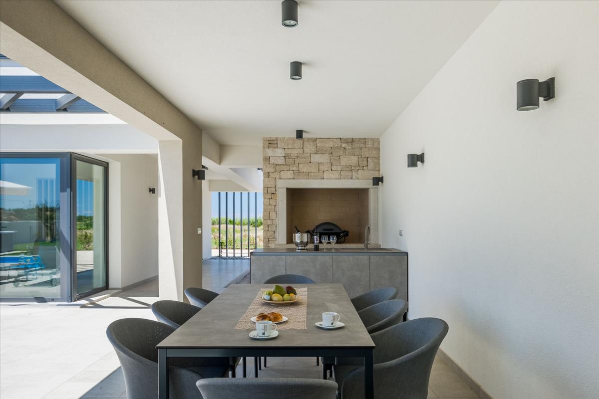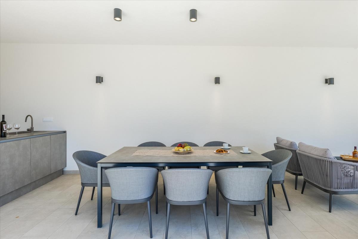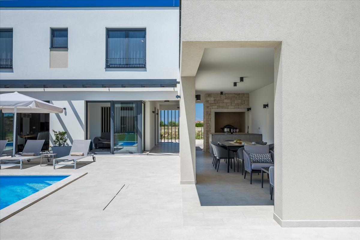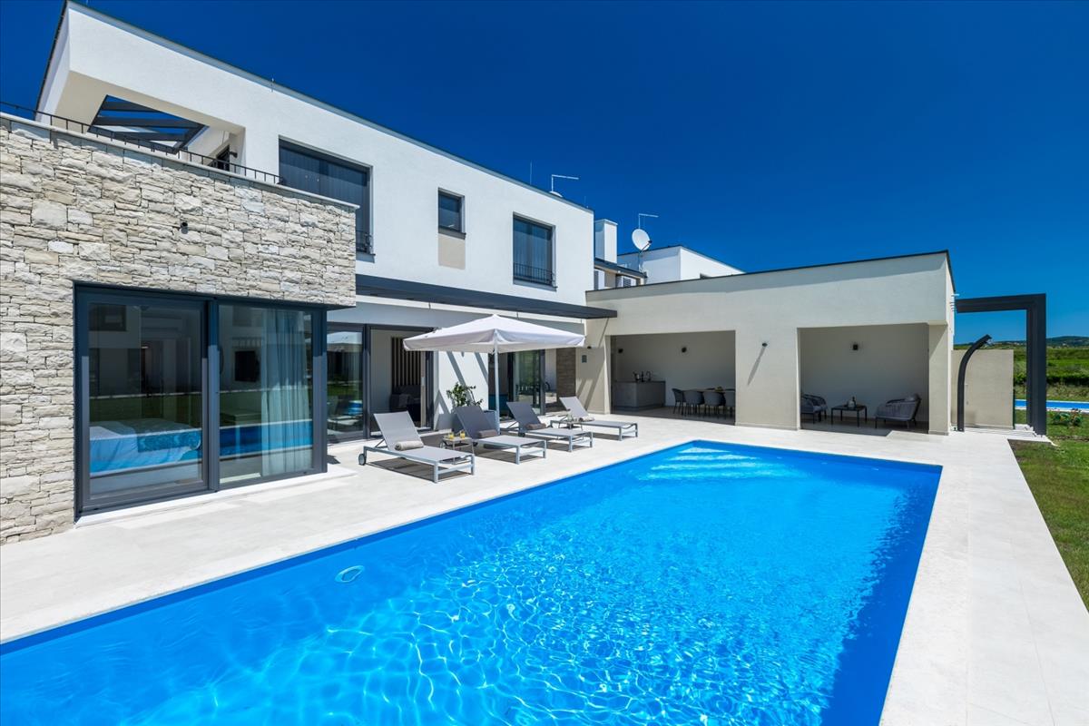 Elegáns villa eladó Brtoniglában, Isztrián, amely a luxus, a magánélet és a nyugalom tökéletes keverékét kínálja, mindössze 8 km-re az Adriai-tengertől, egy prestízsértékű és rendkívül keresett lakóövezetben.Brtonigla egy bájos isztriai város, amelyet buja zöld növényzet vesz körül, híres olajfaligeteiről, szőlőültetvényeiről és a nyugodt mediterrán életstílusáról, miközben közel marad a legfontosabb látnivalókhoz és népszerű célpontokhoz Isztrián. a Brtonigla központjához közel elhelyezkedő modern luxus villa ideális egész éven át tartó családi élethez, magán nyaralóként vagy magas színvonalú befektetésként turisztikai bérlés céljából. a teljes lakóterület 264 m², az ingatlan gondosan megtervezett két szinten, hogy maximális kényelmet, funkcionalitást és eleganciát biztosítson. a földszinten egy hívogató előszoba, egy tágas, természetes fényben gazdag, nyitott nappali, egy modern konyha étkezővel, egy tárolóhelyiség, egy műszaki helyiség, egy vendég wc mosási lehetőséggel és egy hálószoba saját fürdőszobával és közvetlen hozzáféréssel a medencéhez található. Ez a kialakítás lehetővé teszi a zökkenőmentes beltéri és kültéri életet, valamint a könnyű hozzáférést a parkosított kerthez. Az első emeleten három kényelmes hálószoba található, mindegyik saját fürdőszobával és teraszra való kijárattal, biztosítva a magánéletet, a kényelmet és a gyönyörű kilátást a környező zöld területekre. Minden részletet gondosan megfontoltak, hogy kifinomult és pihentető lakókörnyezetet teremtsenek. a villa modern és energiahatékony rendszerekkel van felszerelve, beleértve a tetőn elhelyezett napkollektorokat, légkondicionálót, padlófűtést és minden szükséges közműcsatlakozást, biztosítva a magas életszínvonalat az év minden szakaszában. a kültéri terület egy gyönyörűen parkosított 480 m²-es kertet tartalmaz olajfákkal, egy nagy fűtött medencét 40 m²-es napozóterasszal, jakuzzit, tágas napozó és pihenőterületeket, valamint egy fedett nyári konyhát grillezési lehetőséggel. a teljesen zárt telek garantálja a teljes magánéletet, és ideális kültéri pihenésre, társas összejövetelekre és az isztriai éghajlat élvezetére. Ez a luxus villa Brtoniglában kiváló lehetőséget kínál a vásárlók számára, akik békés otthont keresnek Isztrián, valamint a befektetők számára, akik jól elhelyezkedő ingatlant keresnek, amely erős potenciállal rendelkezik turisztikai bérlésre és vonzó hozamokra. a modern építészet, a funkcionális belső elrendezés és a kivételes kültéri szolgáltatások kombinációja tökéletes választássá teszi ezt a villát állandó lakhatásra, nyaralásra vagy jövedelmező ingatlanbefektetésre Isztrián. Ref: RE-U-44718