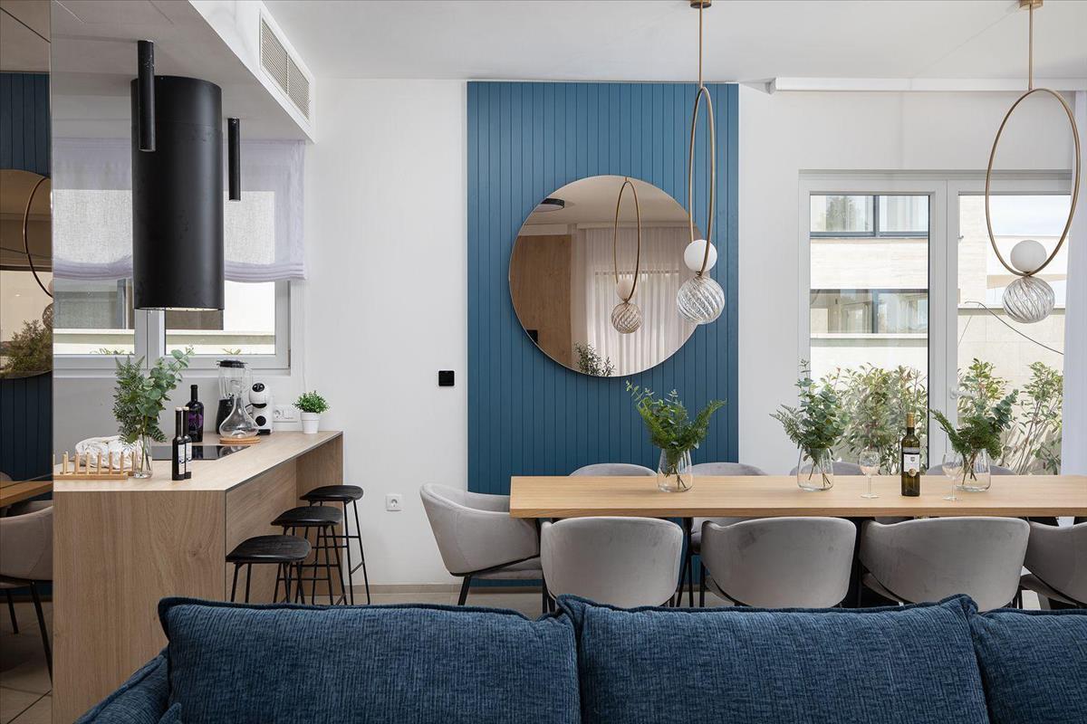 A földszinten egy nyitott terű nappali, konyha és étkező található, panorámás kilátással a tengerre. Nagy üvegajtók vezetnek ki a teraszra és a végtelenített, fűtött medencére, amely szintén a tengerre néz.
