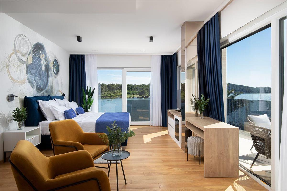 Egy lépcső vezet az első emeletre, ahol három hálószoba található, amelyek többségéből lélegzetelállító kilátás nyílik a tengerre. Minden hálószobához saját fürdőszoba tartozik, amely maximális kényelmet biztosít elegáns dizájnnal és csúcsminőségű piperecikkekkel.