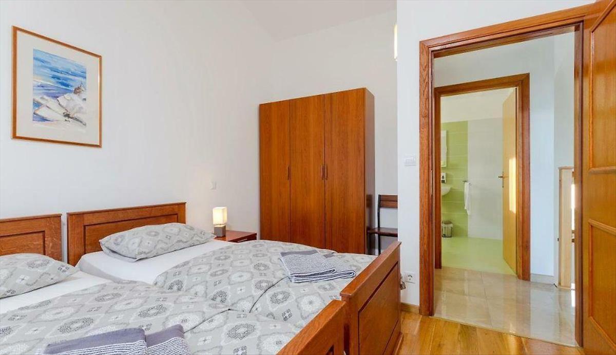 A belső lépcsőn felmászunk az emeletre, ahol előszoba, két hálószoba és egy masszázskádas fürdőszoba található. Az első emeleti mindkét szobából nyílik egy tágas erkély.