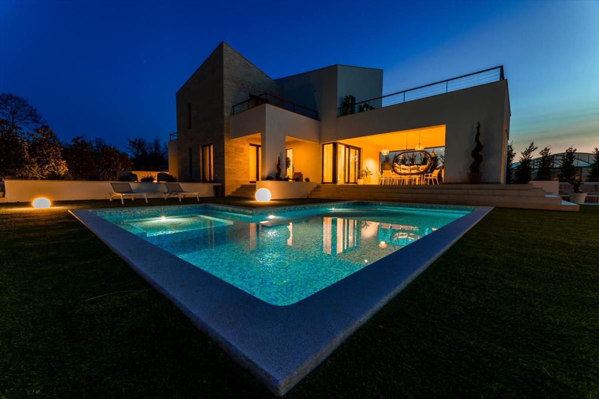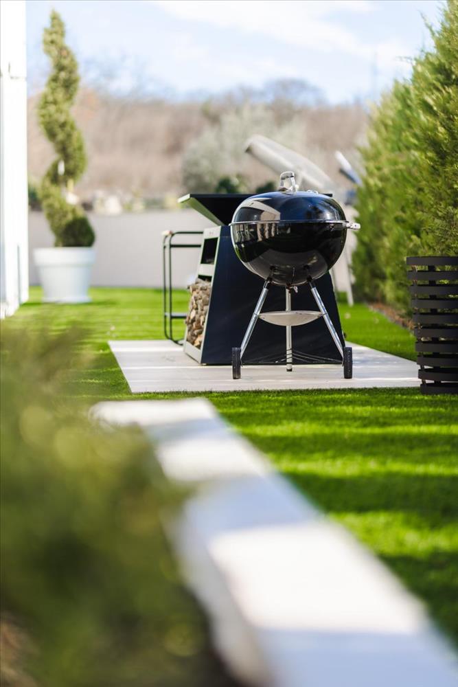 A varázslatos külső terület több mint 700 m², és egy 38 m²-es fűtött medencével rendelkezik, amelyet a legújabb sósvizes rendszer technológiájával tartanak karban. a medence masszázs résszel rendelkezik, és gyöngyház hatású mozaik csempével van burkolva, amely a napfényben csillog. Van egy napozóterület, több különleges kialakítású pihenőhely, buja táj, és egy grillező zóna egy luxus Quan kültéri grillel.