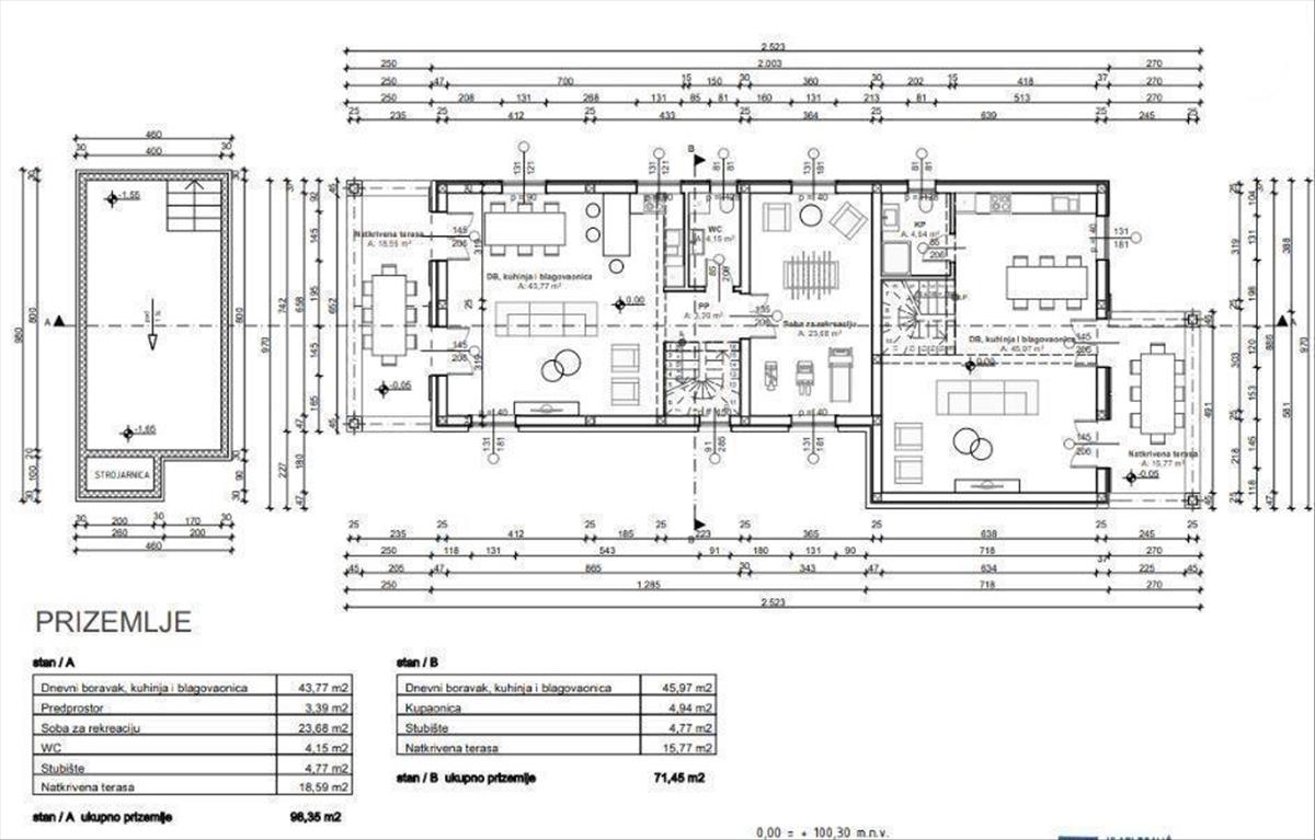 A teraszon keresztül jutunk be a nagy nappali konyhával és étkezővel, a földszinten található még egy fürdőszoba, egy tároló és egy rekreációs helyiség.
