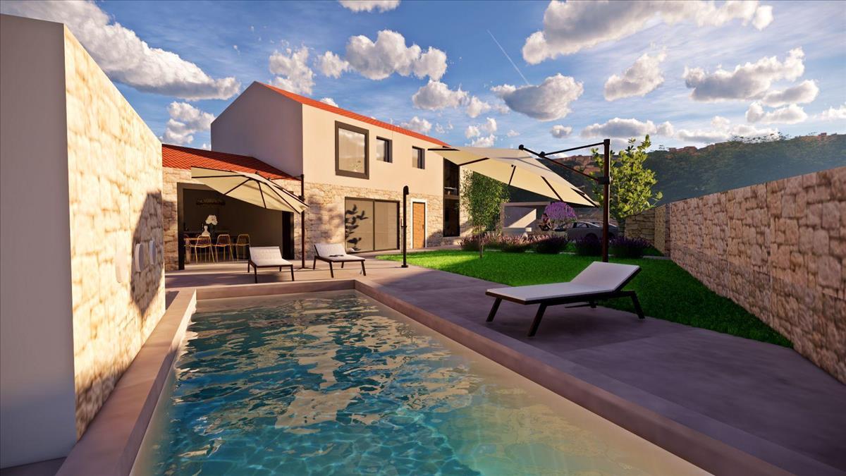 Labin város közelében, csendes környéken zöldövezetben, kifogástalan kőház medencével eladó.