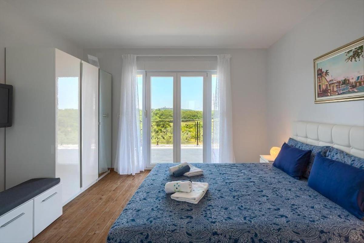 A felső szinten három további hálószoba található, amelyek mindegyike egy nagy fedett teraszra nyílik, ahonnan lenyűgöző, akadálytalan kilátás nyílik a környező vidékre, a mezőkre, az olajfaligetekre és Buje városára. Minden hálószobához saját fürdőszoba tartozik.