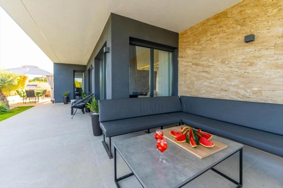 A villa földszintjét különösen különlegessé teszik a nagy tolóüvegajtók, amelyek könnyedén összekötik a belső teret a kültéri udvarral, így a végtelen tér érzetét keltik. a nappaliból közvetlenül elérhetők a fedett teraszok, valamint a medencerészleg napozóterasszal.