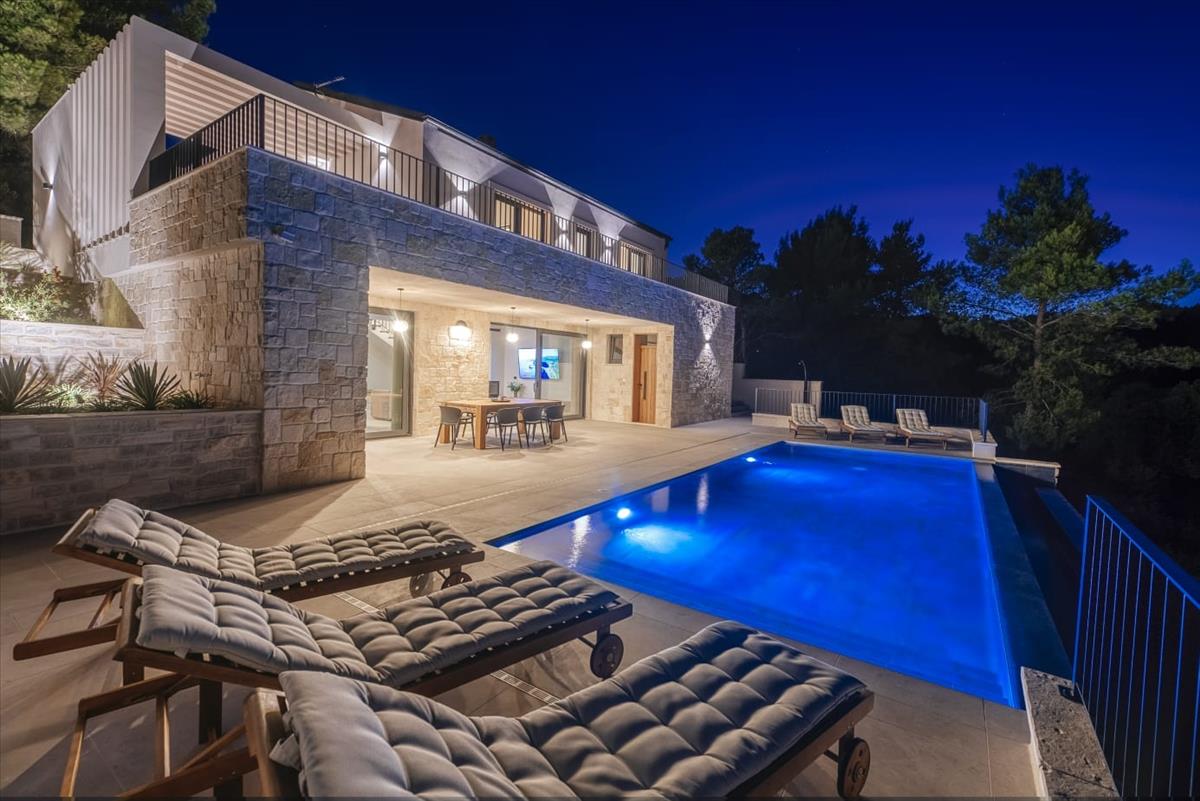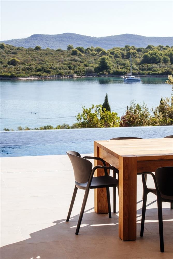 Egy exkluzív, modern villa medencével és panorámás tengerre néző kilátással eladó Iž szigetén, Mali Iž faluban, mindössze 80 méterre a parttól.