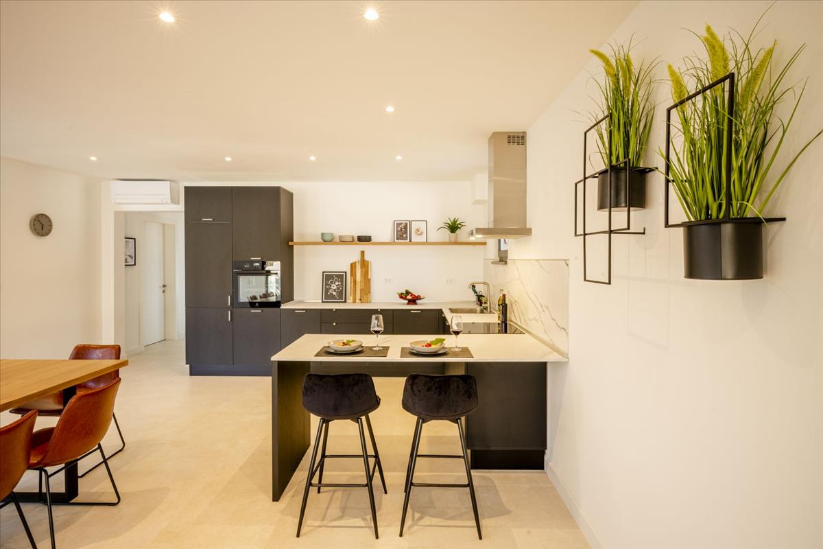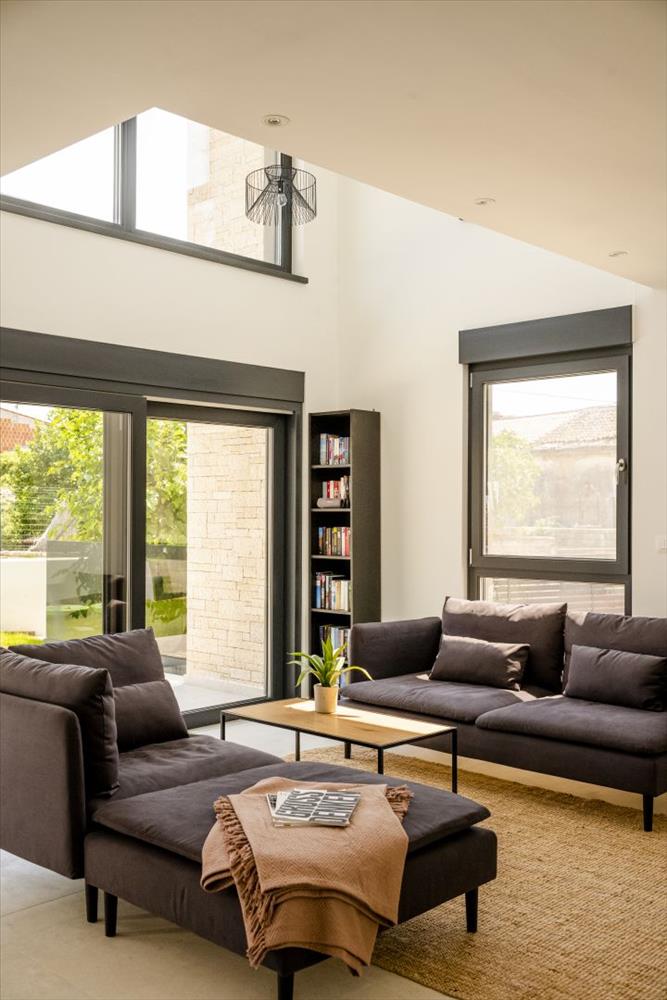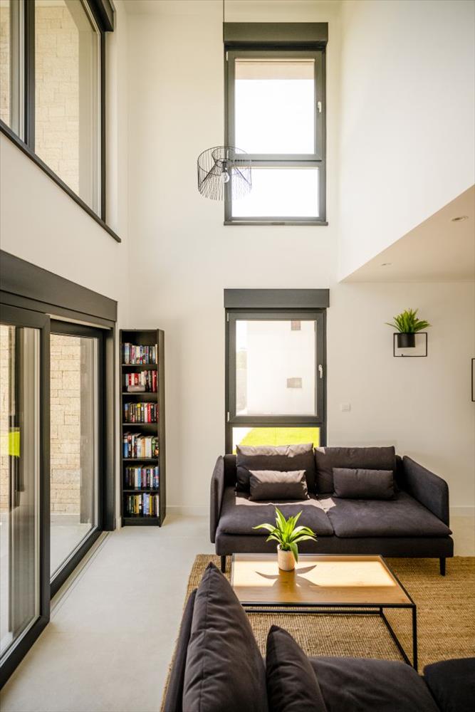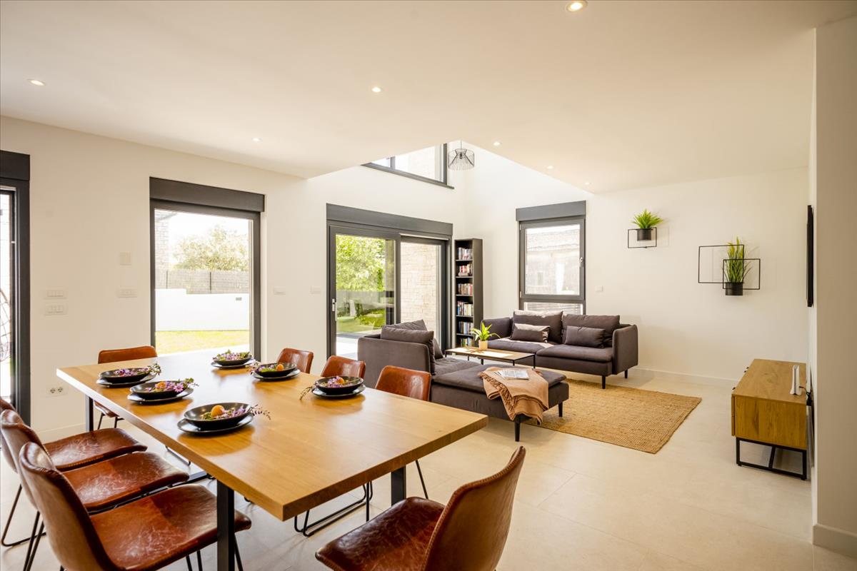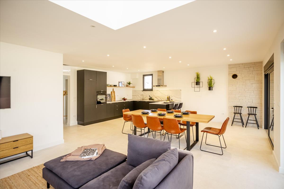 Ez a gyönyörűen megtervezett otthon 230 m² területű, két szinten elosztva. a földszinten található egy előszoba, egy tárolóhelyiség, egy fürdőszoba és egy hálószoba saját fürdőszobával, amely kifejezetten mozgáskorlátozottak számára lett kialakítva. Az open-concept nappali területe magában foglalja a konyhát, az étkezőt és a tágas nappalit, közvetlen hozzáféréssel egy fedett teraszhoz és egy parkosított kerthez – ideális szabadtéri étkezéshez, pihenéshez és szórakozáshoz.