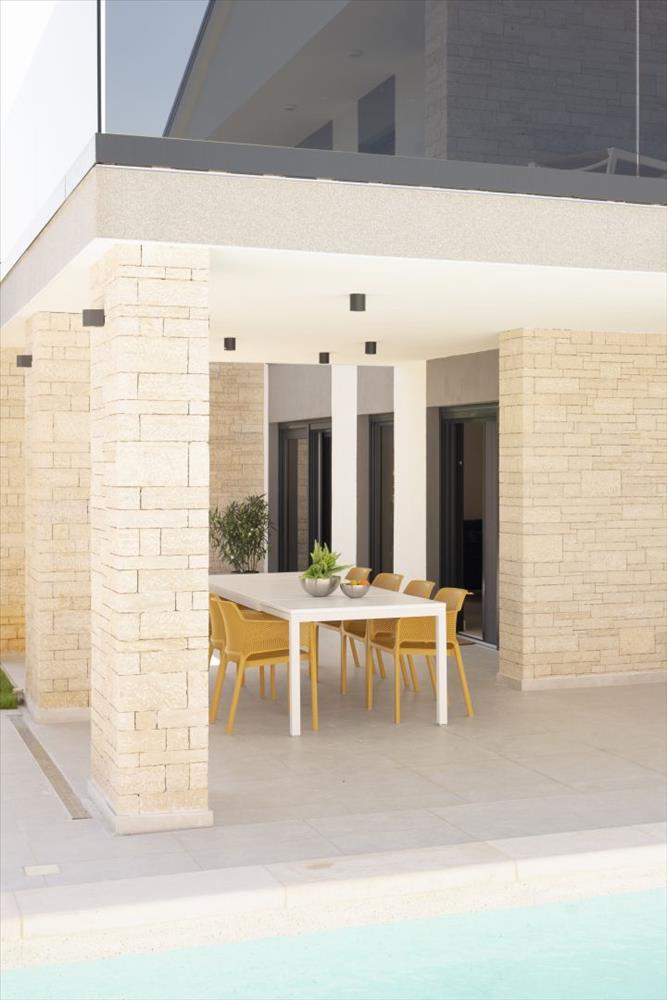 A tulajdon teljesen bútorozott és felszerelt, ízléses belső befejezésekkel, beleértve a hálószobákban a parkettát és a többi helyiségben a kerámia burkolatot. a kerített és parkosított udvar 748 m² területű, amely tartalmaz egy 11 x 4 méteres fűtött medencét napozó terasszal, tökéletes a meleg isztriai napok élvezetéhez. a kert öntözőrendszerrel is rendelkezik a könnyű karbantartás érdekében.