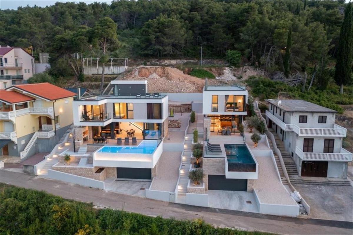 A villa alsó szintjén egy teljesen felszerelt konyha, étkező és nappali található, amely nyitott térként van kialakítva. a nappaliban található üvegfal rengeteg fényt enged be a nap folyamán, és a teraszon egy gyönyörű végtelenített medence is található. a teraszról, valamint a villa minden szobájából lenyűgöző kilátás nyílik a közeli szigetekre, az Adriai-tengerre és a naplementére. a villa alsó szintjén egy külön wc és egy mosókonyha is található.