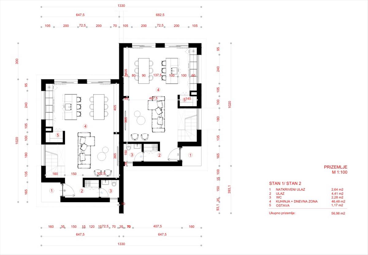 Konyha és nappali terület: 46, 48 m²