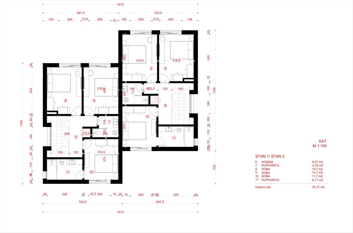 Felső emelet teljes területe: 55, 37 m²
