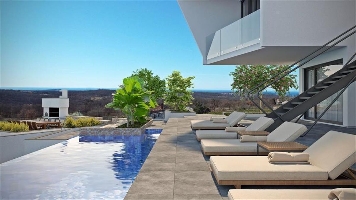 Látványos villa egy rendkívüli helyszínen a festői Momjan környékén Buje közelében, távoli tengerre néző kilátással!